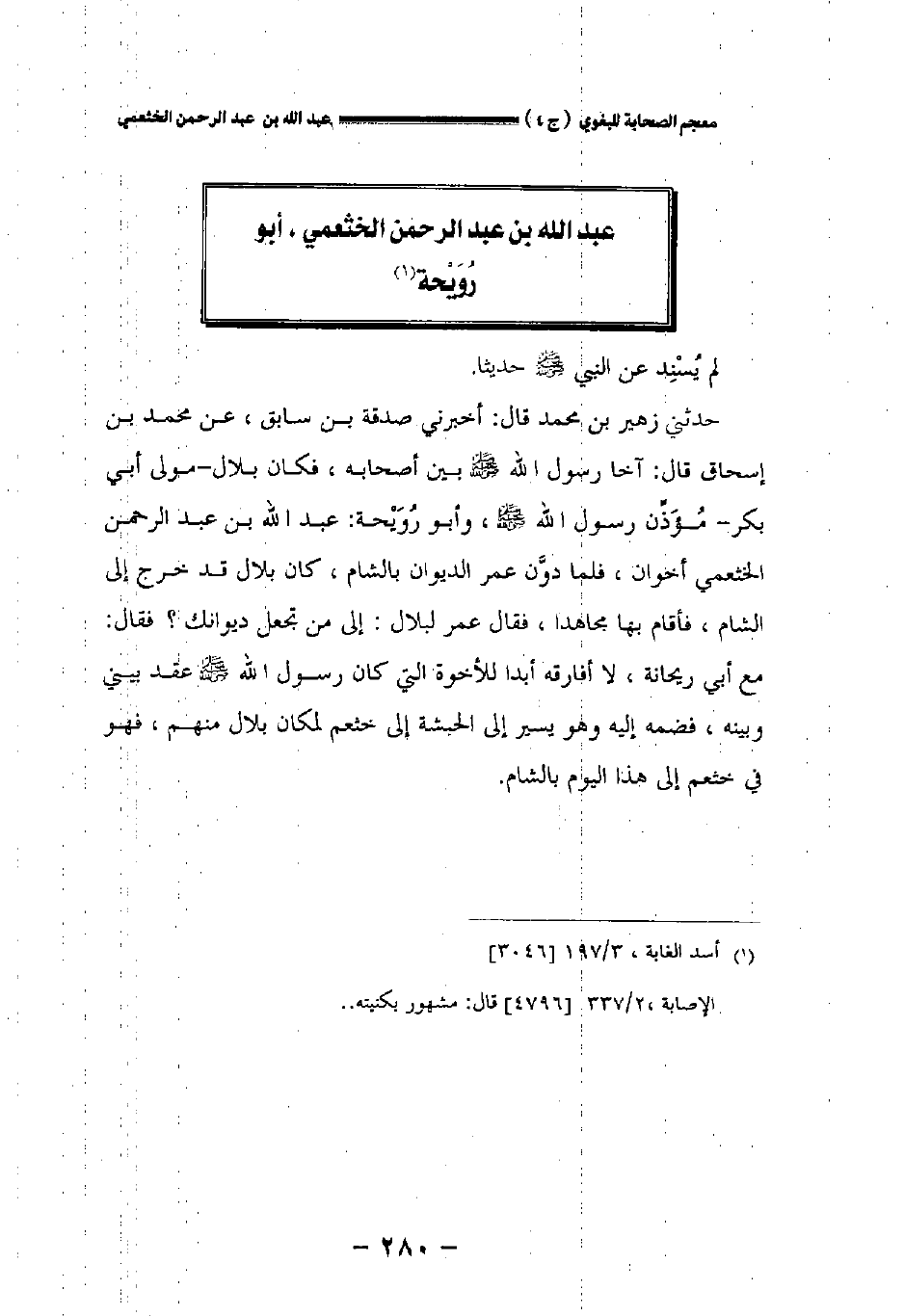 حدثني زهير بن محمد قال: أخبرني صدقة بن سابق عن محمد بن إسحاق قال: آخى رسول الله صلى الله عليه وسلم بين أصحابه فكان بلال مولى أبي بكر مؤذن رسول الله صلى الله عليه وسلم وأبو رويحة عبد الله بن عبد الرحمن الخثعمي أخوان فلما دون عمر الديوان بالشام كان بلال قد خرج إلى الشام فأقام بها مجاهدا فقال عمر لبلال: إلى من تجعل ديوانك؟ فقال: مع أبي ريحانة لا أفارقه أبدا للأخوة التي كان رسول الله صلى الله عليه وسلم عقد بيني وبينه فضمه إليه وهو يسير إلى الحبشة إلى خثعم لمكان بلال منهم فهو في خثعم إلى هذا اليوم بالشام.