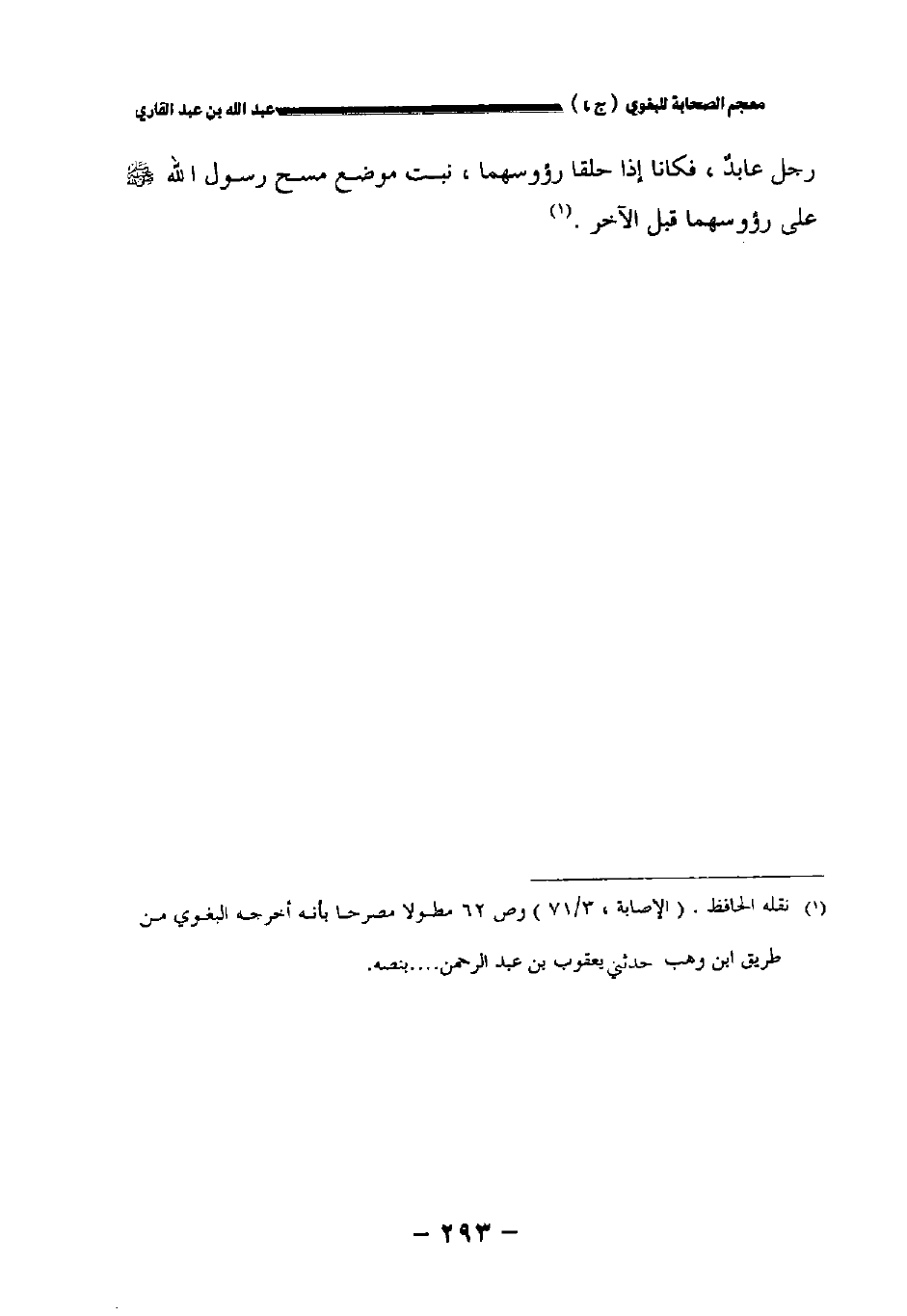 رجل عابد فكانا إذا حلقا رؤوسهما نبت موضع مسح رسول الله صلى الله عليه وسلم على رؤوسهما قبل الآخر.