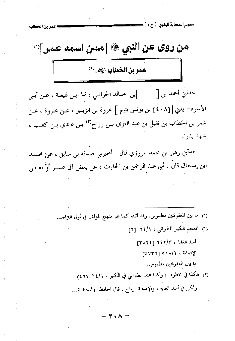 حدثني أحمد بن [] بن خالد الحراني نا ابن لهيعة عن أبي الأسود يعني //٤٠٨// [بن يونس يتيم] عروة بن الزبير عن عروة عن عمر بن الخطاب بن نفيل بن عبد العزى بن رزاح بن عدي بن كعب شهد بدرا.
