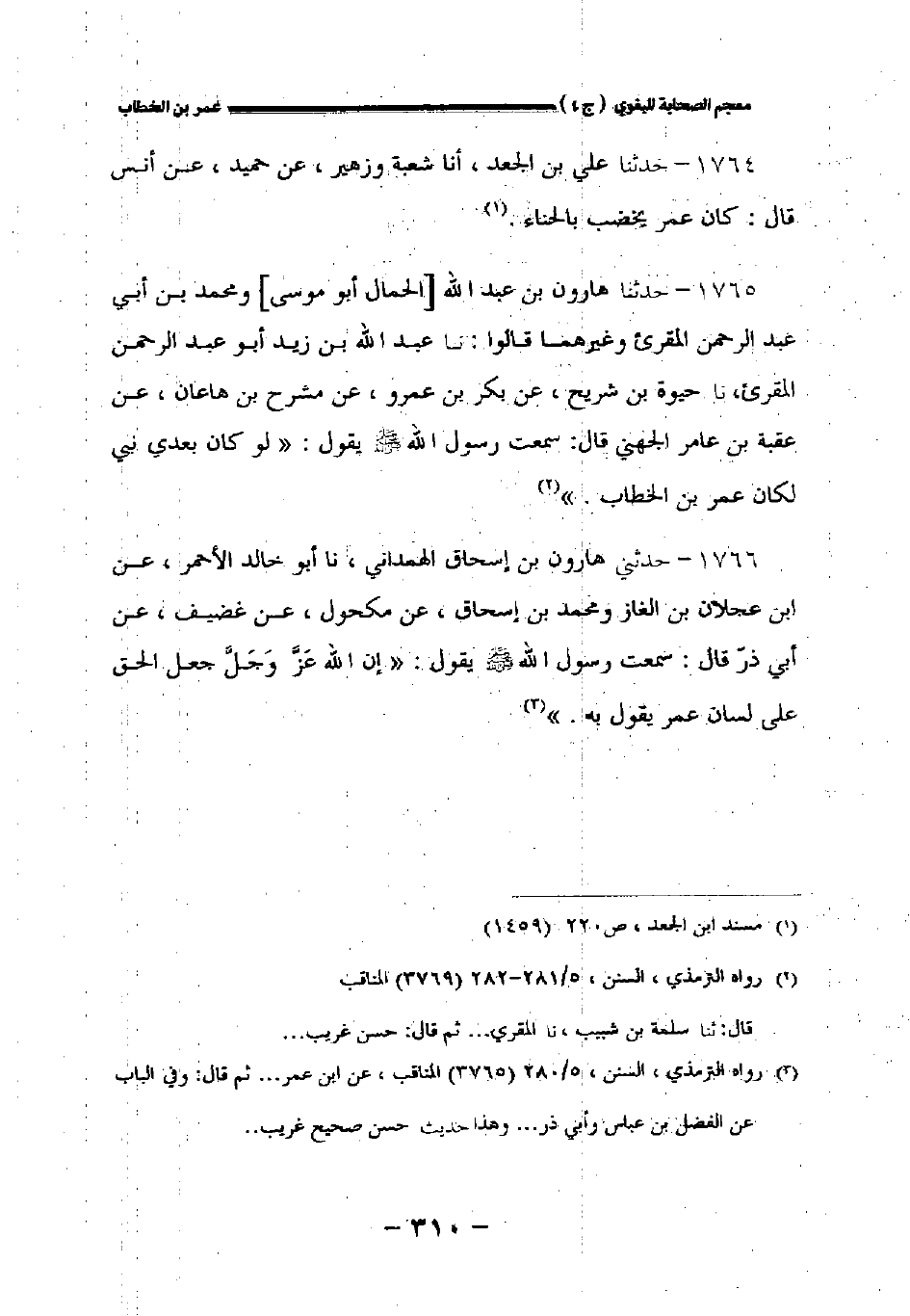 ١٧٦٤ - حدثنا علي بن الجعد أخبرنا شعبة وزهير عن حميد عن أنس قال: كان عمر يخضب بالحناء.