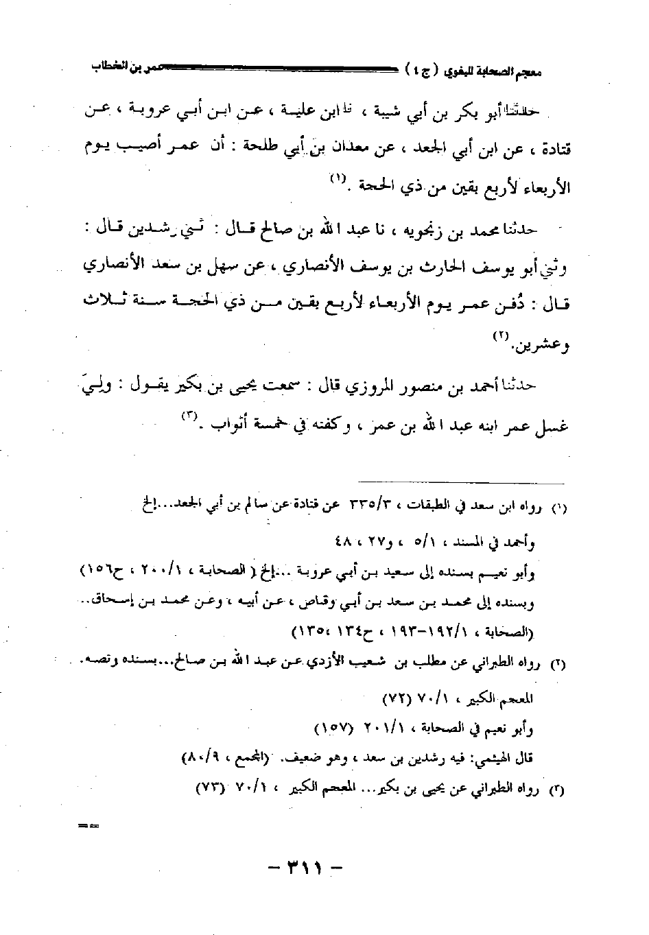 حدثنا أبو بكر بن أبي شيبة نا ابن علية عن ابن أبي عروبة عن قتادة عن ابن أبي الجعد عن معدان بن أبي طلحة: أن عمر أصيب يوم الأربعاء لأربع بقين من ذي الحجة.