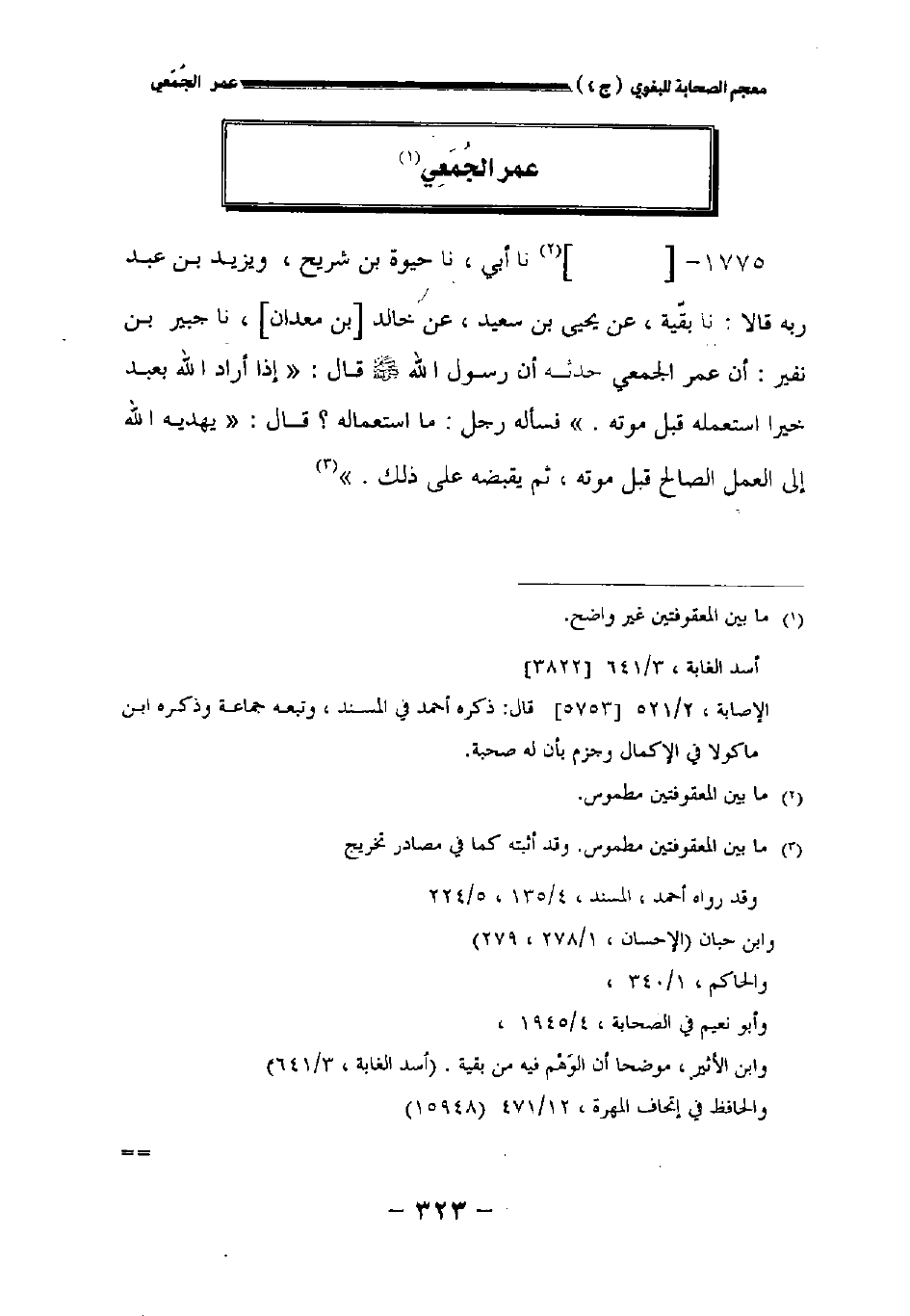 ١٧٧٥ - [] نا أبي نا حيوة بن شريح ويزيد بن عبد ربه قالا: نا بقية عن يحيى بن سعيد عن خالد [بن معدان] نا جبير بن نفير: أن عمر الجمعي أن رسول الله صلى الله عليه وسلم قال: " إذا أراد الله بعبد خيرا استعمله قبل موته. " فسأله رجل: ما استعماله؟ قال: " يهديه الله إلى العمل الصالح قبل موته ثم يقبضه على ذلك.
