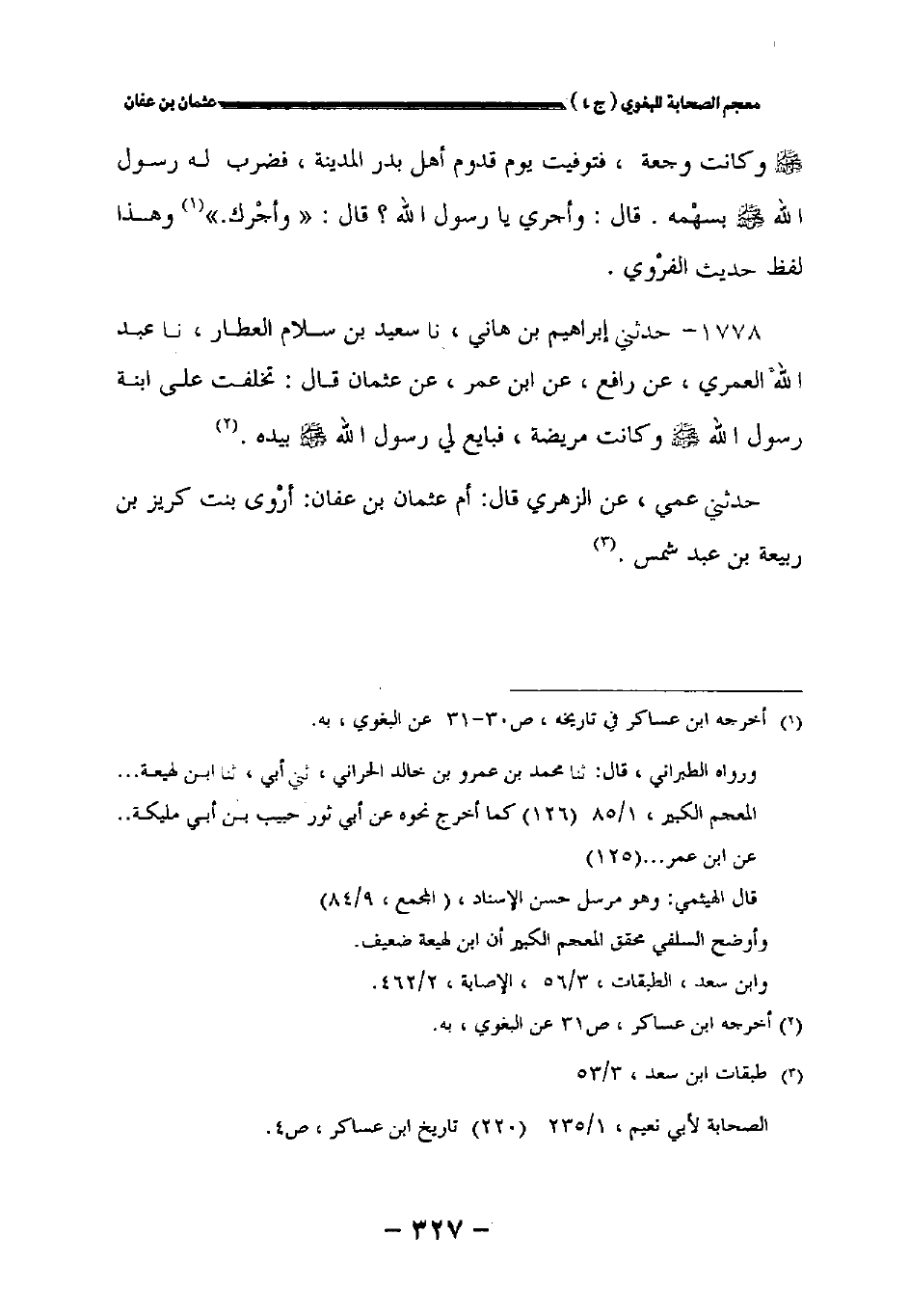 ١٧٧٨ - حدثني إبراهيم بن هانىء نا سعيد بن سلام العطار نا عبد الله العمري عن رافع عن ابن عمر عن عثمان قال: تخلفت على ابنة رسول الله صلى الله عليه وسلم وكانت مريضة فبايع لي رسول الله صلى الله عليه وسلم بيده.