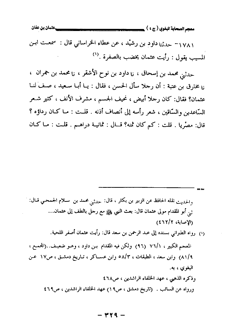 حدثني محمد بن إسحاق نا داود بن نوح الأشقر نا محمد بن حمران نا مخارق بن عتبة: أن رجلا سأل الحسن فقال: يا أبا سعيد صف لنا عثمان؟ فقال: كان رجلا أبيض نحيف الجسم مشرف الأنف كثير شعر الساعدين والساقين شعر رأسه إلى أنصاف أذنه. قلت: ما كان رداؤه؟ قال: مصريا. قلت: كم كان ثمنه؟ قال: ثمانية دراهم. قلت: ما كان