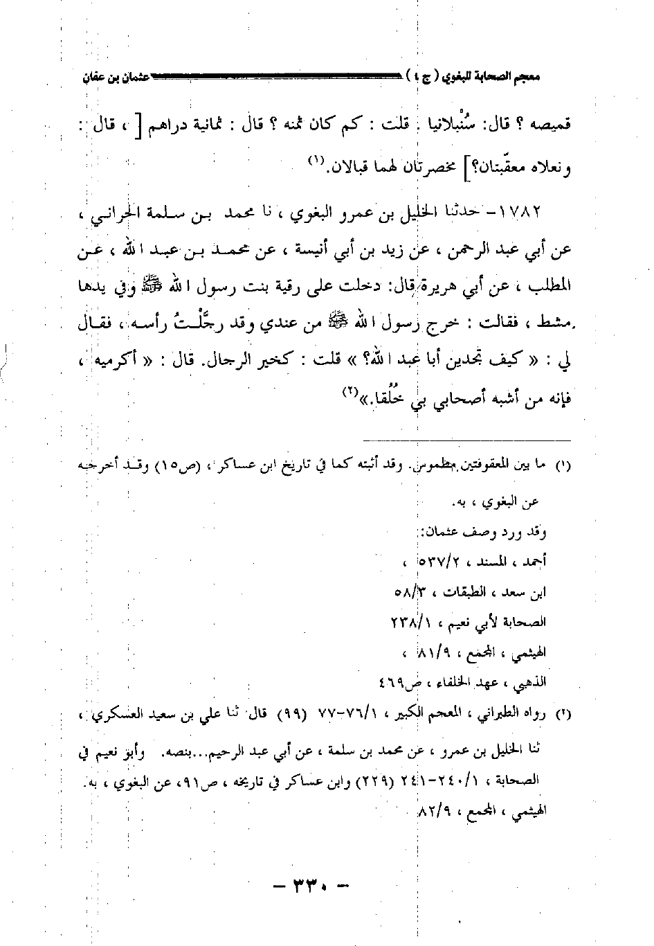 ١٧٨٢ - حدثنا الخليل بن عمرو البغوي نا محمد بن سلمة الحراني عن أبي عبد الرحمن عن زيد بن أبي أنيسة عن محمد بن عبد الله عن المطلب عن أبي هريرة قال: دخلت على رقية بنت رسول الله صلى الله عليه وسلم وفي يدها مشط فقالت: خرج رسول الله صلى الله عليه وسلم من عندي وقد رجلت رأسه فقال لي: " كيف تجدين أبا عبد الله؟ " قلت: كخير الرجال قال: " أكرميه فإنه من أشبه أصحابي بي خلقا ".