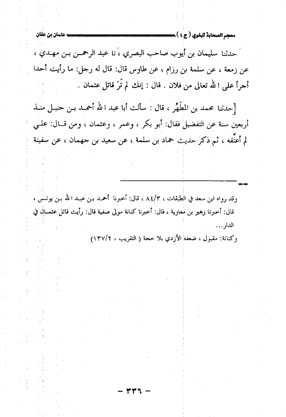 حدثنا سليمان بن أيوب صاحب البصري نا عبد الرحمن بن مهدي عن زمعة عن سلمة بن رزام عن طاوس قال: قال له رجل: ما رأيت أحدا أجرأ على الله تعالى من فلان. قال: إنك لم تر قاتل عثمان.