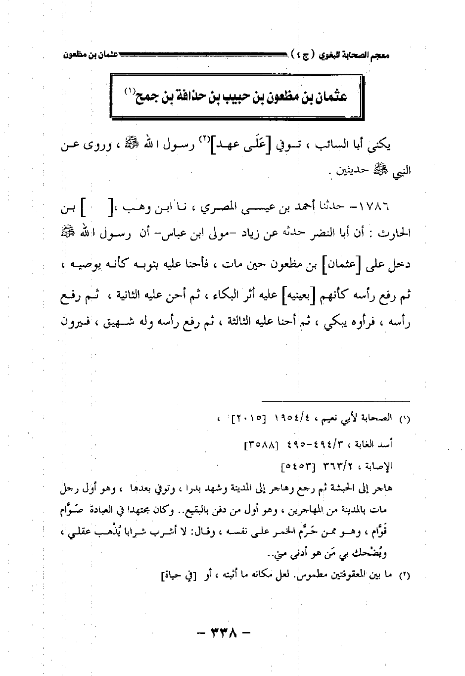 ١٧٨٦ - حدثنا أحمد بن عيسى المصري نا ابن وهب [] بن الحارث: أن أبا النضر حدثه عن زياد - مولى ابن عباس - أن رسول الله صلى الله عليه وسلم دخل على [عثمان] بن مظعون حين مات فأحنا عليه بثوبه كأنه يوصيه، ثم رفع رأسه كأنهم [بعينيه] عليه أثر البكاء ثم أحن عليه الثانية ثم رفع رأسه فرأوه يبكي ثم أحنا عليه الثالثة ثم رفع رأسه وله شهيق فيرون