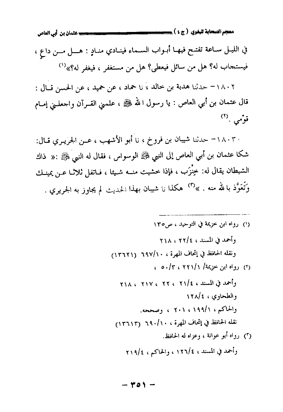 ١٨٠٢ - حدثنا هدبة بن خالد نا حماد عن حميد عن الحسن قال: قال عثمان بن أبي العاص: يا رسول الله صلى الله عليه وسلم علمني القرآن واجعلني إمام قومي.