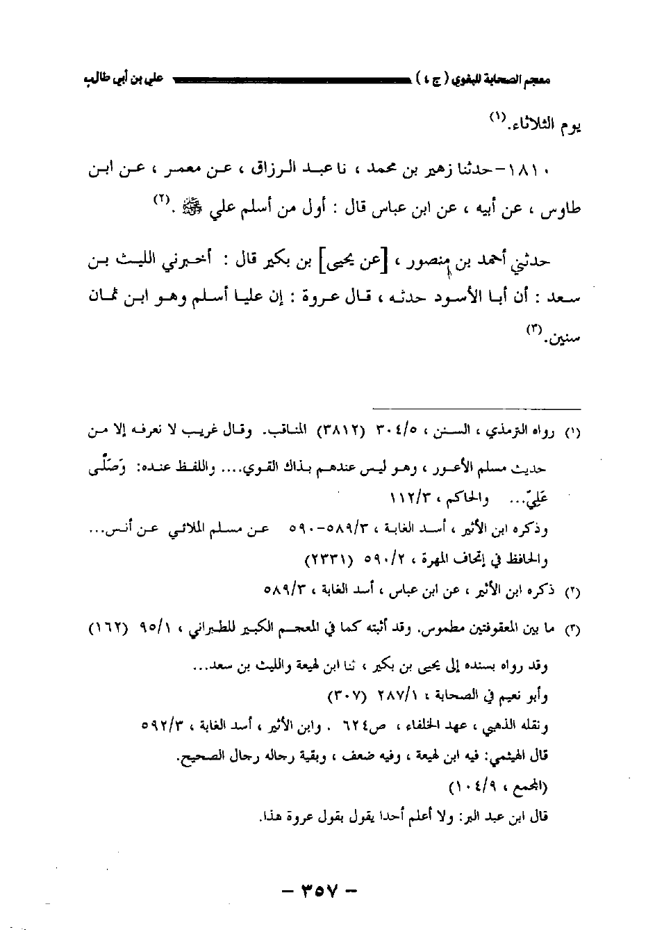 ١٨١٠ - حدثنا زهير بن محمد نا عبد الرزاق عن معمر عن ابن طاوس عن أبيه عن ابن عباس قال: أول من أسلم علي رضي الله عنه.