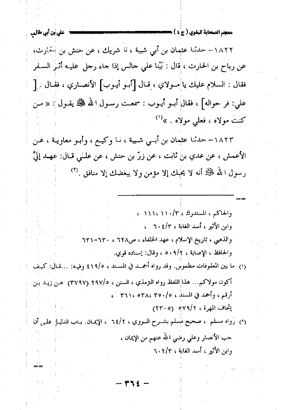 ١٨٢٢ - حدثنا عثمان بن أبي شيبة نا شريك عن حنش بن الحارث عن رباح بن الحارث قال: بينا علي جالس إذا جاء رجل عليه أثر السفر فقال: السلام عليك يا مولاي قال [أبو أيوب] الأنصاري فقال [علي: فر حوله] فقال أبو أيوب: سمعت رسول الله صلى الله عليه وسلم يقول: " من كنت مولاه فعلي مولاه ".