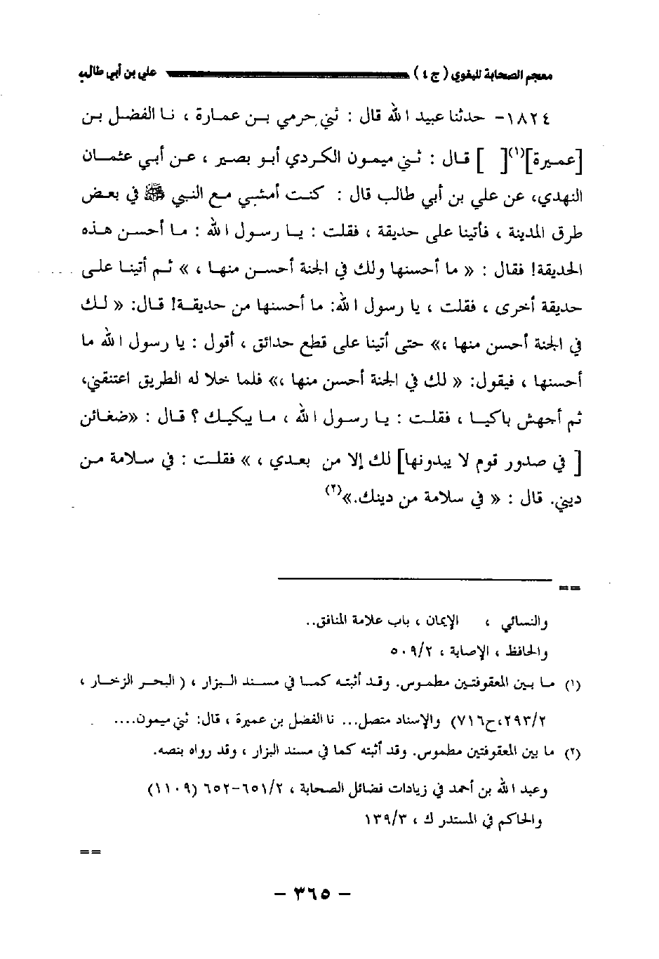 ١٨٢٤ - حدثنا عبيد الله قال: حدثني حرمي بن عمارة نا الفضل بن [عميرة] [] قال: حدثني ميمون الكردي أبو بصير عن أبي عثمان النهدي عن علي بن أبي طالب قال: كنت أمشي مع النبي صلى الله عليه وسلم في بعض طرق المدينة فأتينا على حديقة فقلت: يا رسول الله: ما أحسن هذه الحديقة! فقال: " ما أحسنها ولك في الجنة أحسن منها " ثم أتينا على حديقة أخرى فقلت، يا رسول الله ما أحسنها من حديقة! قال: " لك في الجنة أحسن منها " حتى أتينا على قطع حدائق أقول: يا رسول الله ما أحسنها فيقول: " لك في الجنة أحسن منها " فلما خلا له الطريق اعتنقني ثم أجهش باكيا فقلت: يا رسول الله ما يبكيك؟ قال: " ضغائن [في صدور قوم لا يبدونها] لك إلا من بعدي " فقلت: في سلامة من ديني. قال: " في سلامة من دينك ".