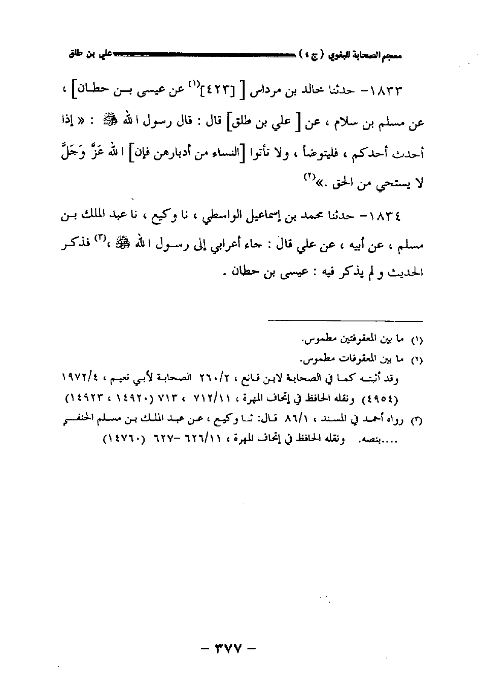 ١٨٣٣ - حدثنا خالد بن مرداس//٤٢٣// [عن عيسى بن حطان] عن مسلم بن سلام عن [علي بن طلق] قال: قال رسول الله صلى الله عليه وسلم: " إذا أحدث أحدكم فليتوضأ ولا تأتوا النساء من أدبارهن فإن] الله عز وجل لا يستحي من الحق.
