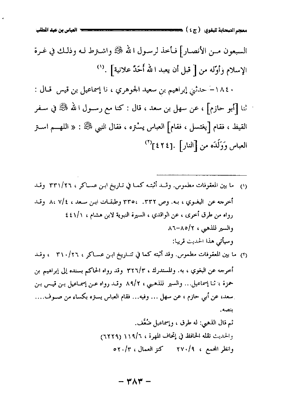 ١٨٤٠ - حدثني إبراهيم بن سعيد الجوهري نا إسماعيل بن قيس قال: ثنا [أبو حازم] عن سهل بن سعد قال: كان مع رسول الله صلى الله عليه وسلم في سفر القيظ فقام [يغتسل فقام] العباس يستره فقال النبي صلى الله عليه وسلم: " اللهم استر العباس وولده من [النار]. //٤٢٤//.