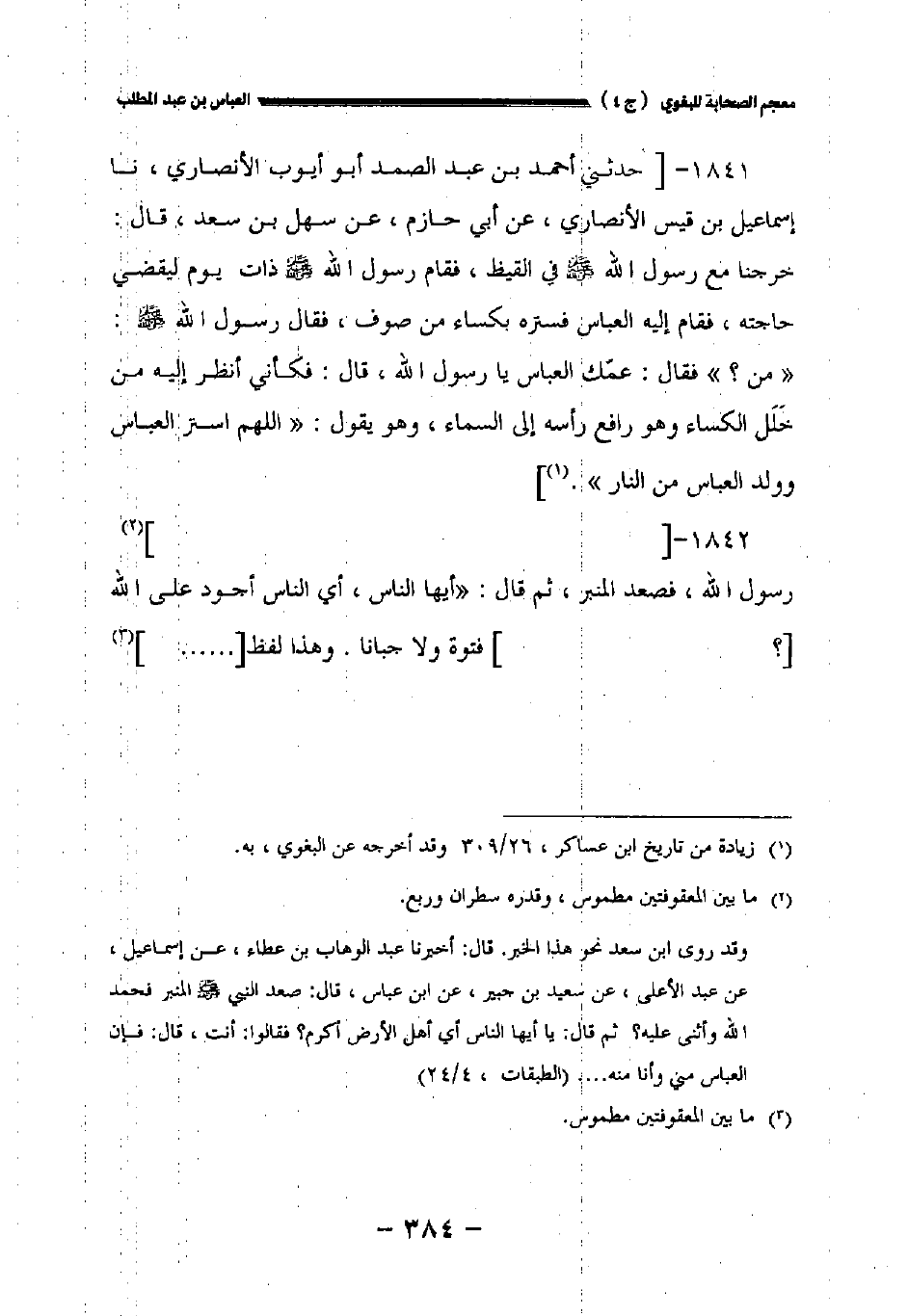 ١٨٤١ - [حدثني أحمد بن عبد الصمد أبو أيوب الأنصاري نا إسماعيل بن قيس الأنصاري عن أبي حازم عن سهل بن سعد قال: خرجنا مع رسول الله صلى الله عليه وسلم في القيظ فقام رسول الله صلى الله عليه وسلم ذات يوم ليقضي حاجته فقام إليه العباس فستره بكساء من صوف فقال رسول الله صلى الله عليه وسلم: " من؟ " فقال: عمك العباس يا رسول الله قال: فكأني أنظر إليه من خلل الكساء وهو رافع رأسه إلى السماء وهو يقول: " اللهم استر العباس وولد العباس من النار ".