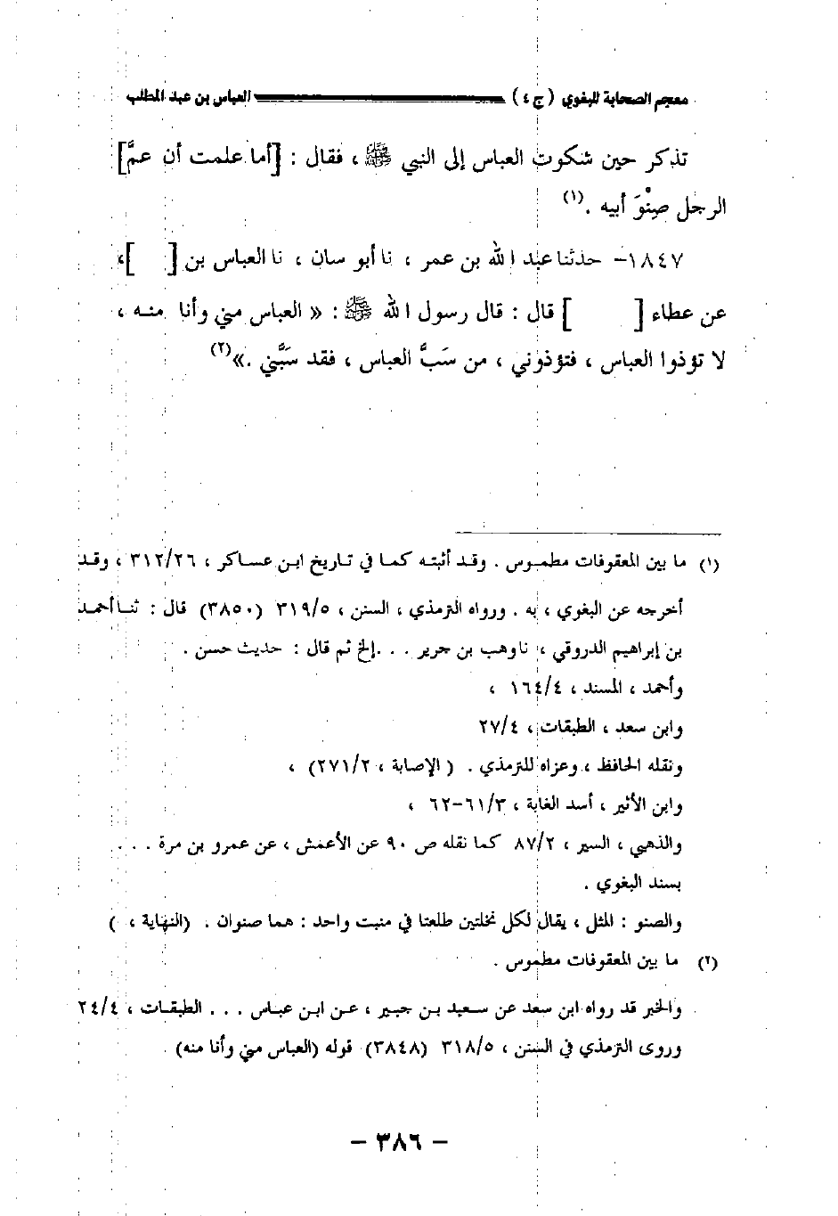١٨٤٧ - حدثنا عبد الله بن عمر نا أبو سان نا العباس بن [] عن عطاء [] قال: قال رسول الله صلى الله عليه وسلم: " العباس مني وأنا منه لا تؤذوا العباس فتؤذوني من سب العباس فقد سبني.