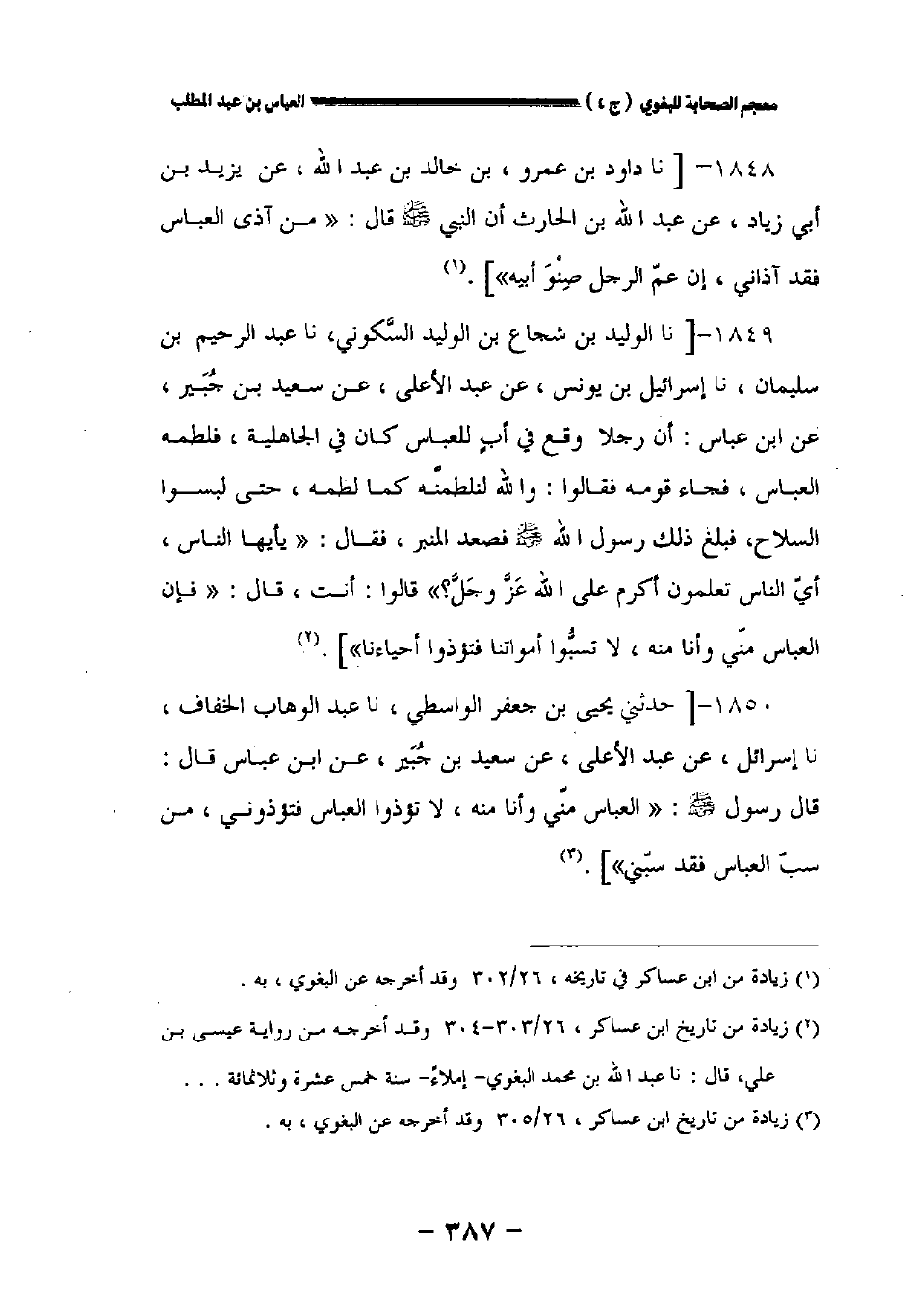 ١٨٤٩ - [نا الوليد بن شجاع بن الوليد السكوني نا عبد الرحيم بن سليمان نا إسرائيل بن يونس عن عبد الأعلى عن سعيد بن جبير عن ابن عباس: أن رجلا وقع في أب للعباس كان في الجاهلية فلطمه العباس فجاء قومه فقالوا: والله لنلطمنه كما لطمه حتى لبسوا السلاح فبلغ ذلك رسول الله صلى الله عليه وسلم فصعد المنبر فقال: " يأيها الناس أي الناس تعلمون أكرم على الله عز وجل؟ " قالوا: أنت، قال: " فإن العباس مني وأنا منه لا تسبوا أمواتنا فتؤذوا أحياءنا "].