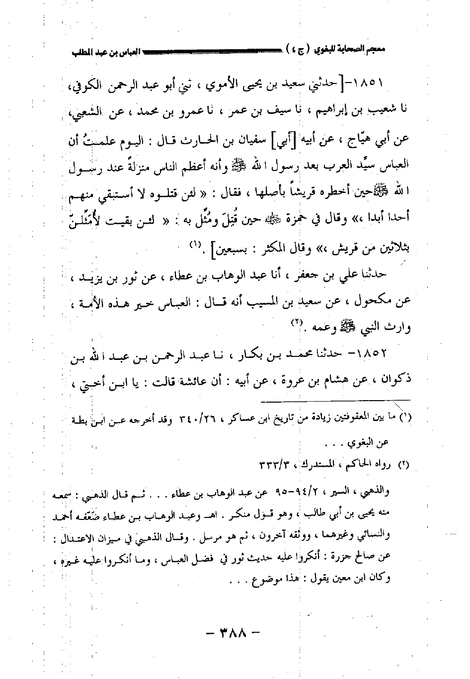 ١٨٥١ - [حدثني سعيد بن يحيى الأموي حدثني أبو عبد الرحمن الكوفي نا شعيب بن إبراهيم نا سيف بن عمر نا عمرو بن محمد عن الشعبي عن أبي هياج عن أبيه [أبي] سفيان بن الحارث قال: اليوم علمت أن العباس سيد العرب بعد رسول الله صلى الله عليه وسلم وأنه أعظم الناس منزلة عند رسول الله صلى الله عليه وسلم حين أخطره قريشا بأصلها فقال: " لئن قتلوه لا أستبقي منهم أحدا أبدا " وقال في حمزة رضي الله عنه حين قتل ومثل به: " لئن بقيت لأمثلن بثلاثين من قريش " وقال المكثر: بسبعين].