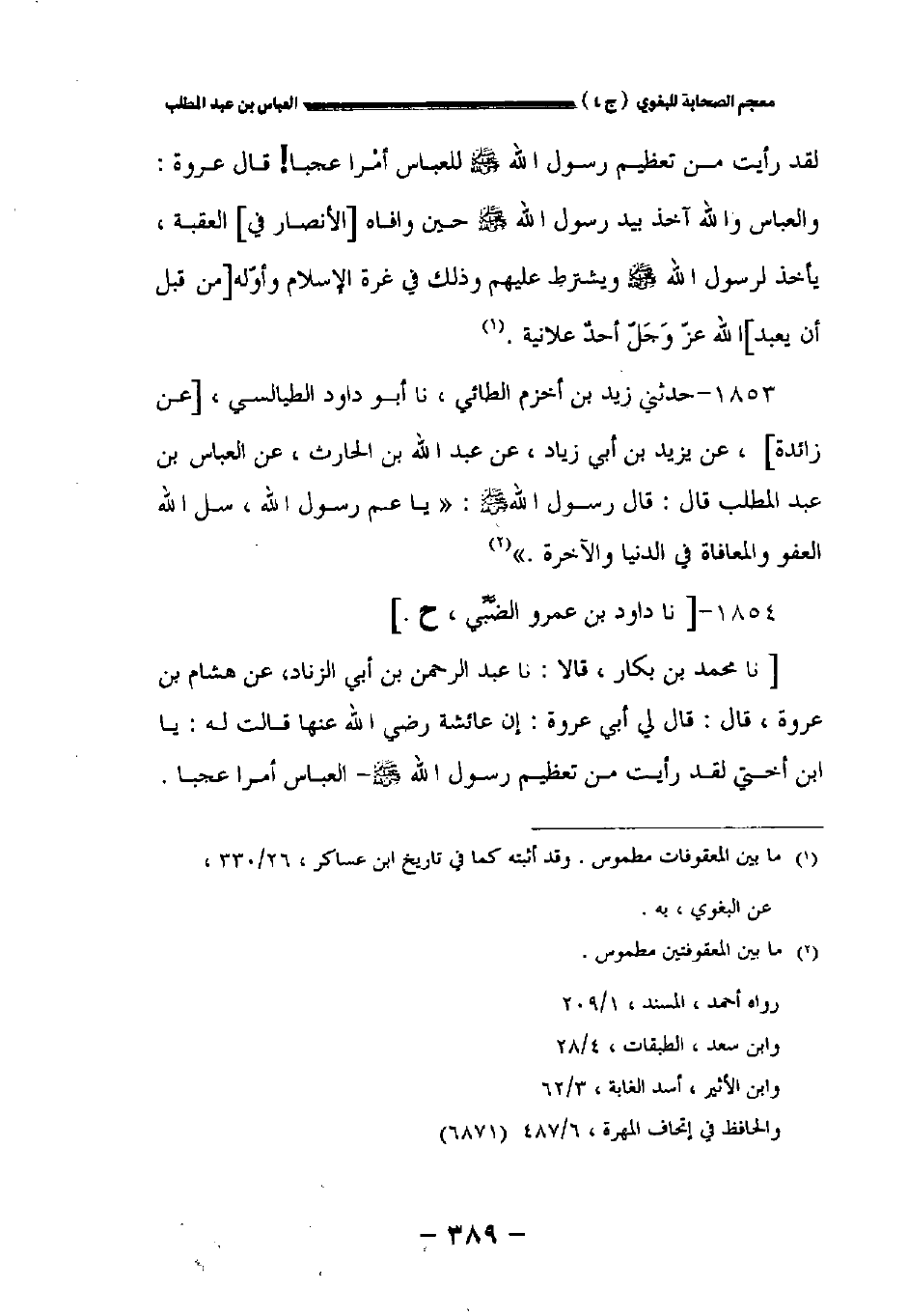 ١٨٥٣ - حدثني زيد بن أخزم الطائي نا أبو داود الطيالسي [عن زائدة] عن يزيد بن أبي زياد عن عبد الله بن الحارث عن العباس بن عبد المطلب قال: قال رسول الله صلى الله عليه وسلم: " يا عم رسول الله سل الله العفو والمعافاة في الدنيا والآخرة.