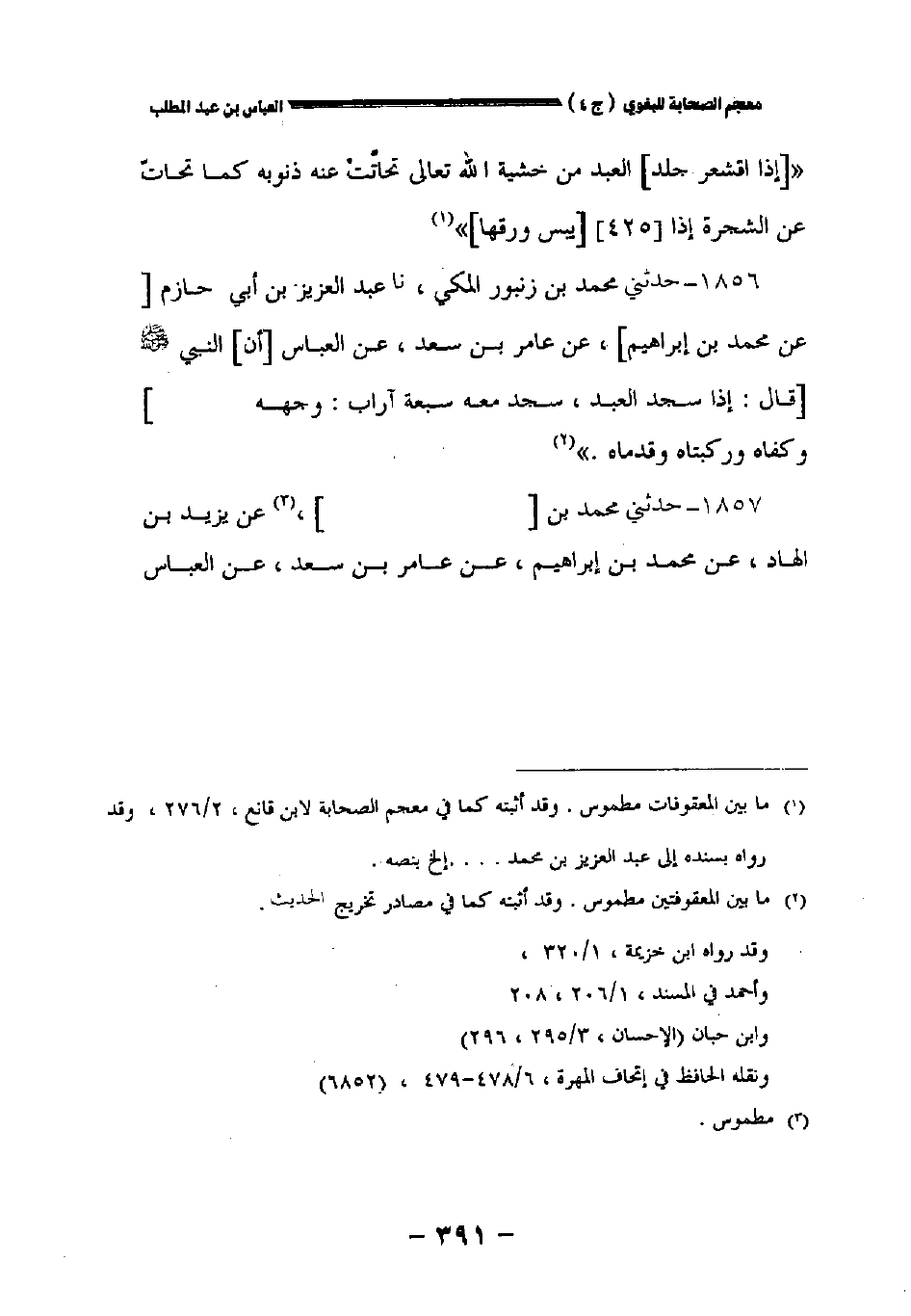 ١٨٥٦ - حدثني محمد بن زنبور المكي نا عبد العزيز بن أبي حازم [عن محمد بن إبراهيم] عن عامر بن سعد عن العباس [أن] النبي صلى الله عليه وسلم [قال: إذا سجد العبد سجد معه سبعة آراب: وجهه] وكفاه وركبتاه وقدماه.