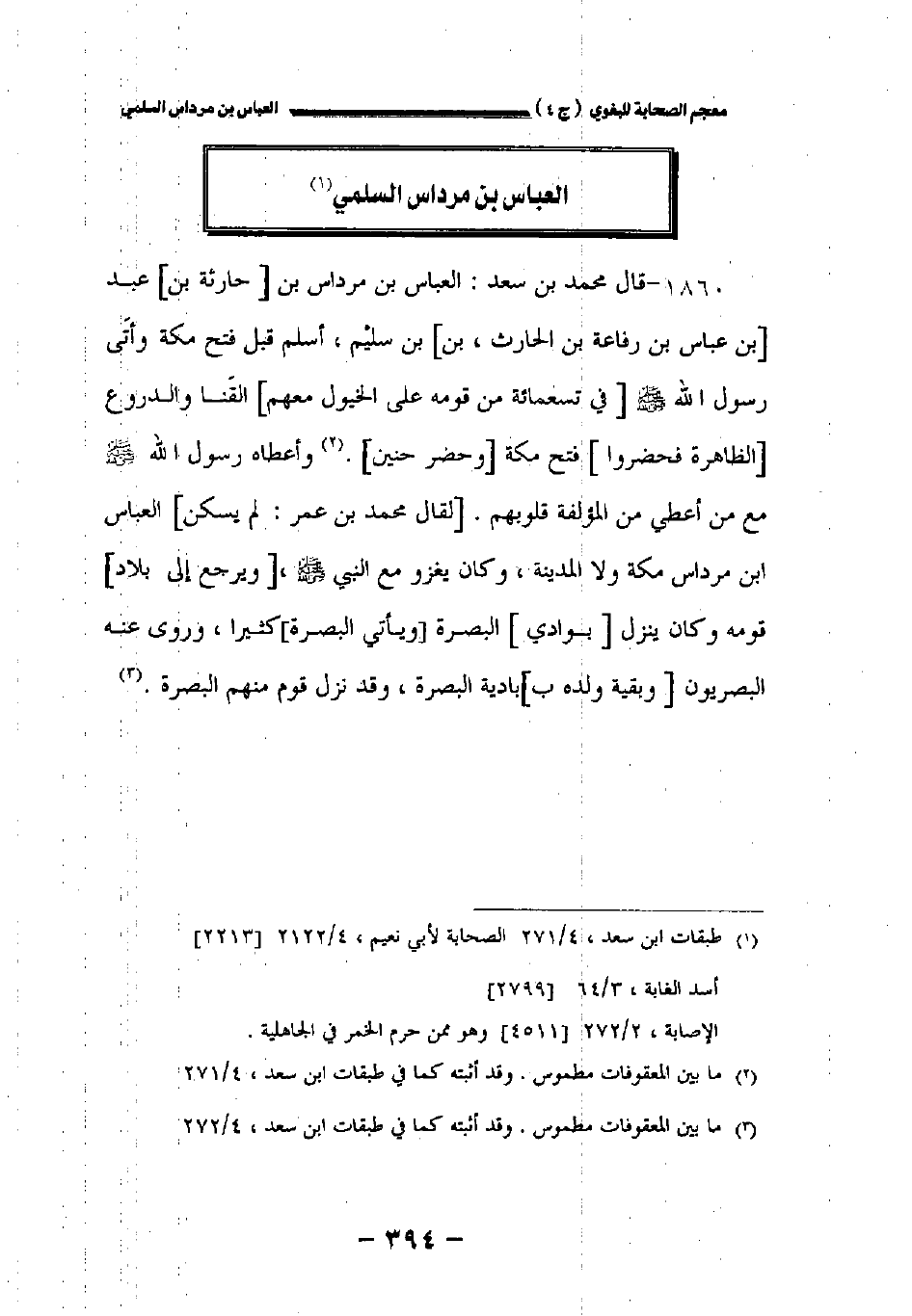 ١٨٦٠ - قال محمد بن سعد: العباس بن مرداس بن [حارثة بن] عبد [بن عباس بن رفاعة بن الحارث بن] سليم أسلم قبل فتح مكة وأتى رسول الله صلى الله عليه وسلم [في تسعمائة من قومه على الخيول معهم] القنا والدروع [الظاهرة فحضروا] فتح مكة [وحضر حنين]. وأعطاه رسول الله صلى الله عليه وسلم مع من أعطى من المؤلفة قلوبهم [لقال محمد بن عمر: لم يسكن] العباس بن مرداس مكة ولا المدينة وكان يغزو مع النبي صلى الله عليه وسلم [ويرجع إلى بلاد] قومه وكان ينزل [بوادي] البصرة [ويأتي البصرة] كثيرا وروى عنه البصريون [وبقية ولده ب] بادية البصرة وقد نزل قوم منهم البصرة.