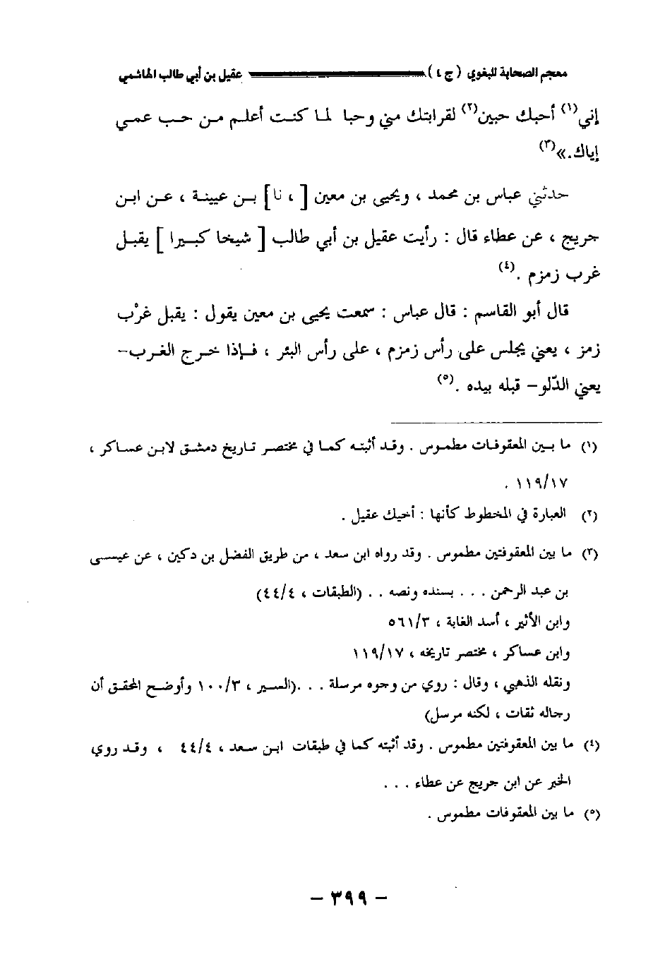 حدثني عباس بن محمد ويحيى بن معين [نا] بن عيينة عن ابن جريج عن عطاء قال: رأيت عقيل بن أبي طالب [شيخا كبيرا] يقبل غرب زمزم.