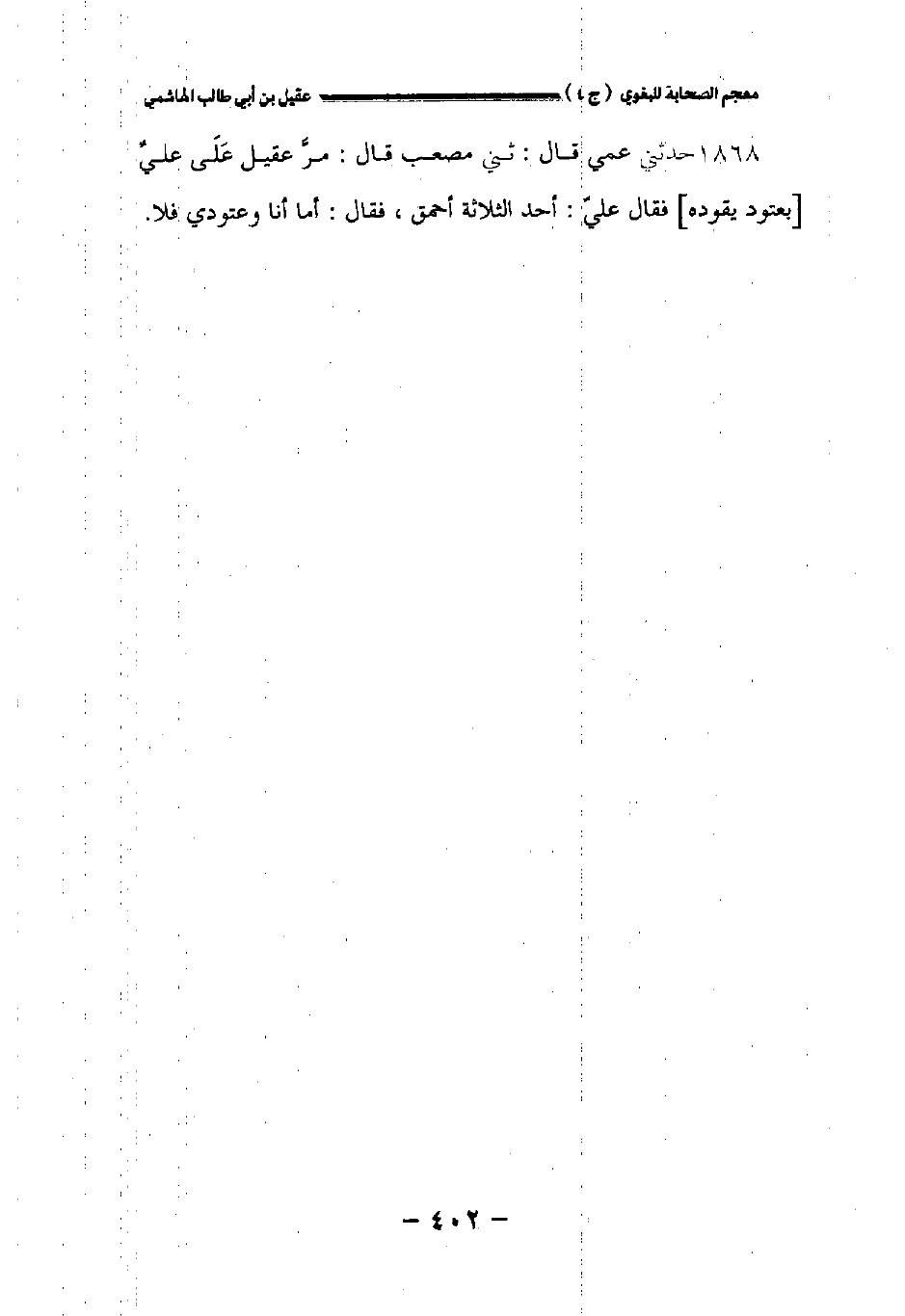 ١٨٦٨ - حدثني عمي قال: حدثني مصعب قال: مر عقيل على علي [بعتود يقوده] فقال علي: أحد الثلاثة أحمق فقال: أما أنا وعتودي فلا.