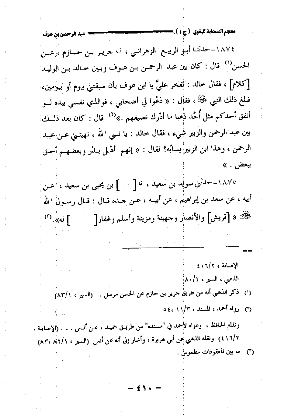 ١٨٧٤ - حدثنا أبو الربيع الزهراني نا جرير بن حازم عن الحسن قال: كان بين عبد الرحمن بن عوف وبين خالد بن الوليد [كلام] فقال خالد: تفخر علي يا ابن عوف بأن سبقتني بيوم أو بيومين فبلغ ذلك النبي صلى الله عليه وسلم فقال: " دعوا لي أصحابي فوالذي نفسي بيده لو أنفق أحدكم مثل أحد ذهبا ما أدرك نصيفهم " قال: كان بعد ذلك بين عبد الرحمن والزبير شيء فقال خالد: يا نبي الله نهيتني عن عبد الرحمن وهذا ابن الزبير يسابه؟ فقال: " إنهم أهل بدر وبعضهم أحق ببعض.