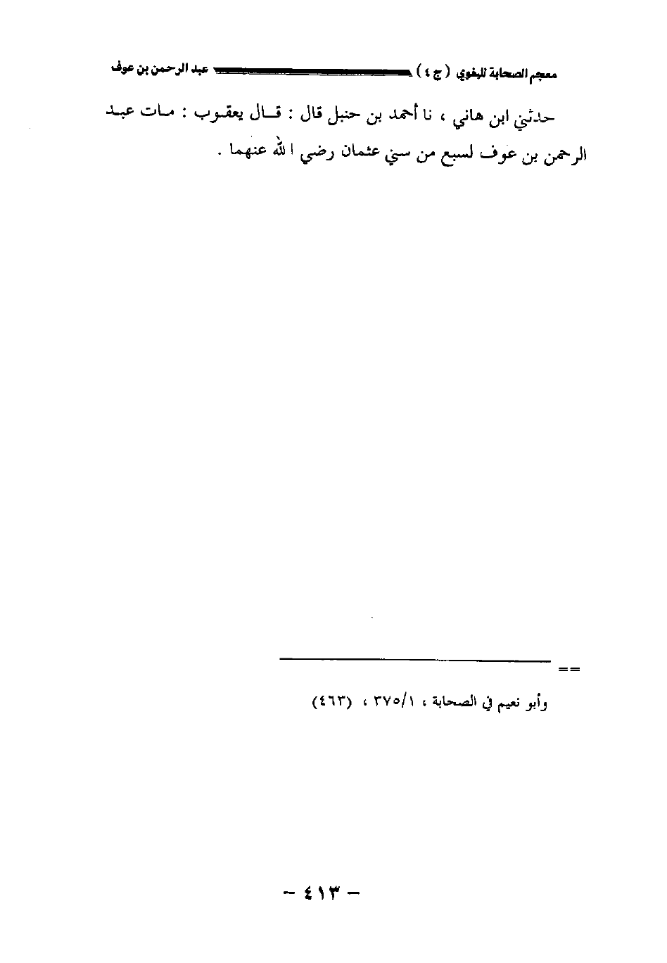 حدثني ابن هاني نا أحمد بن حنبل قال: قال يعقوب: مات عبد الرحمن بن عوف لسبع من سني عثمان رضي الله عنهما.