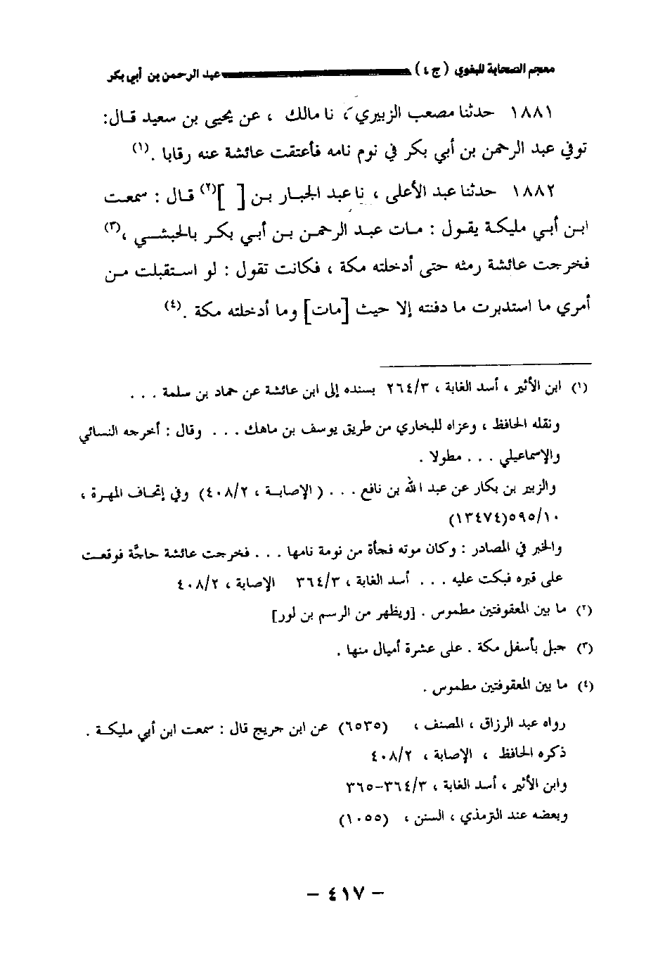 ١٨٨١ - حدثنا مصعب الزبيري نا مالك عن يحيى بن سعيد قال: توفي عبد الرحمن بن أبي بكر في نوم نامه فأعتقت عائشة عنه رقابا.