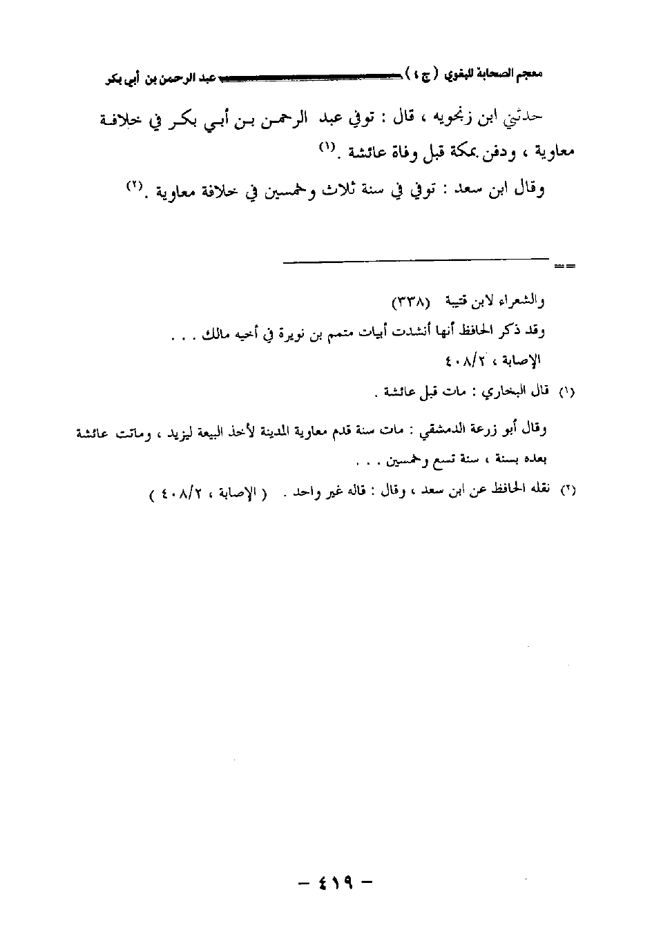 حدثني ابن زنجويه قال: توفي عبد الرحمن بن أبي بكر في خلافة معاوية ودفن بمكة قبل وفاة عائشة.