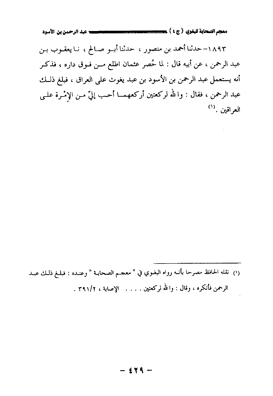 ١٨٩٣ - حدثنا أحمد بن منصور حدثنا أبو صالح نا يعقوب بن عبد الرحمن عن أبيه قال: لما حصر عثمان اطلع من فوق داره فذكر أنه يستعمل عبد الرحمن بن الأسود بن عبد يغوث على العراق فبلغ ذلك عبد الرحمن فقال: والله لركعتين أركعهما أحب إلي من الإمرة على العراقين.