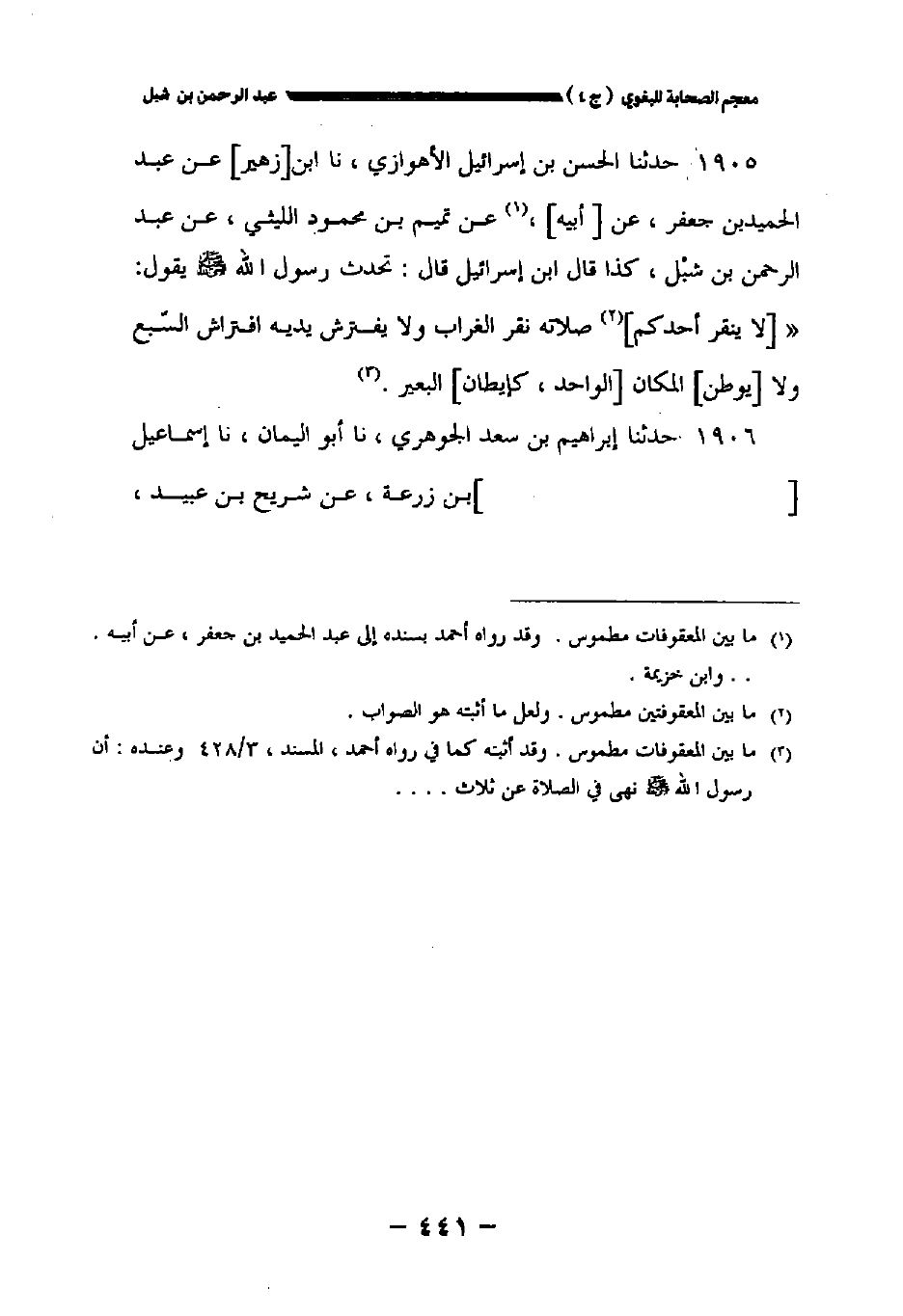 ١٩٠٥ - حدثنا الحسن بن إسرائيل الأهوازي نا ابن [زهير] عن عبد الحميد بن جعفر عن [أبيه] عن تميم بن محمود الليثي عن عبد الرحمن بن شبل كذا قال ابن إسرائيل قال: تحدث رسول الله صلى الله عليه وسلم يقول: " [لا ينقر أحدكم] صلاته نقر الغراب ولا يفترش يديه افتراش السبع ولا [يوطن] المكان [الواحد كإيطان] البعير.