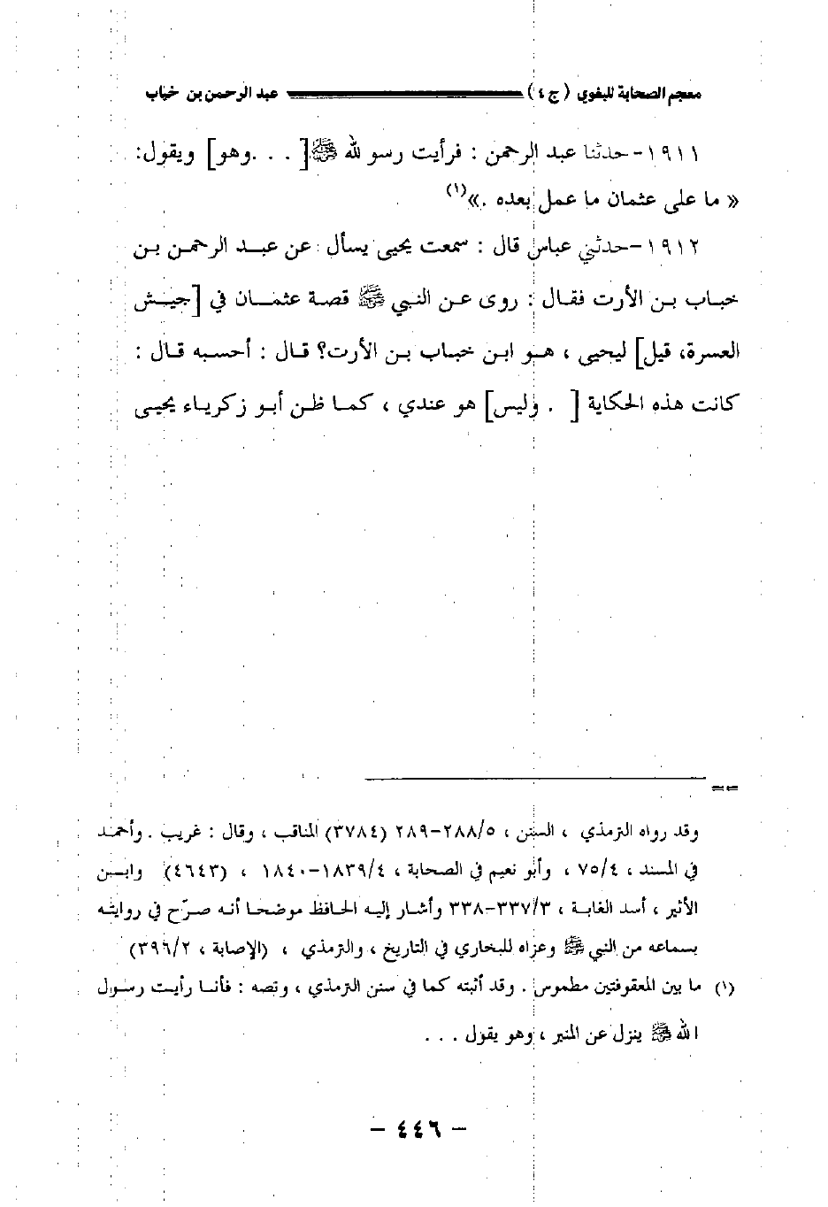 ١٩١٢ - حدثني عباس قال: سمعت يحيى يسأل عن عبد الرحمن بن خباب بن الأرت فقال: روى عن النبي صلى الله عليه وسلم قصة عثمان في [جيش العسرة قيل] ليحيى هو ابن خباب بن الأرت؟ قال: أحسبه قال: كانت هذه الحكاية [.وليس] هو عندي كما ظن أبو زكرياء يحيى
