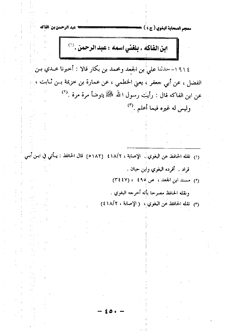 ١٩١٤ - حدثنا علي بن الجعد، ومحمد بن بكار قالا: أخبرنا عدي بن الفضل عن أبي جعفر يعني الخطمي عن عمارة بن خزيمة بن ثابت عن ابن الفاكه قال: رأيت رسول الله صلى الله عليه وسلم يتوضأ مرة مرة.