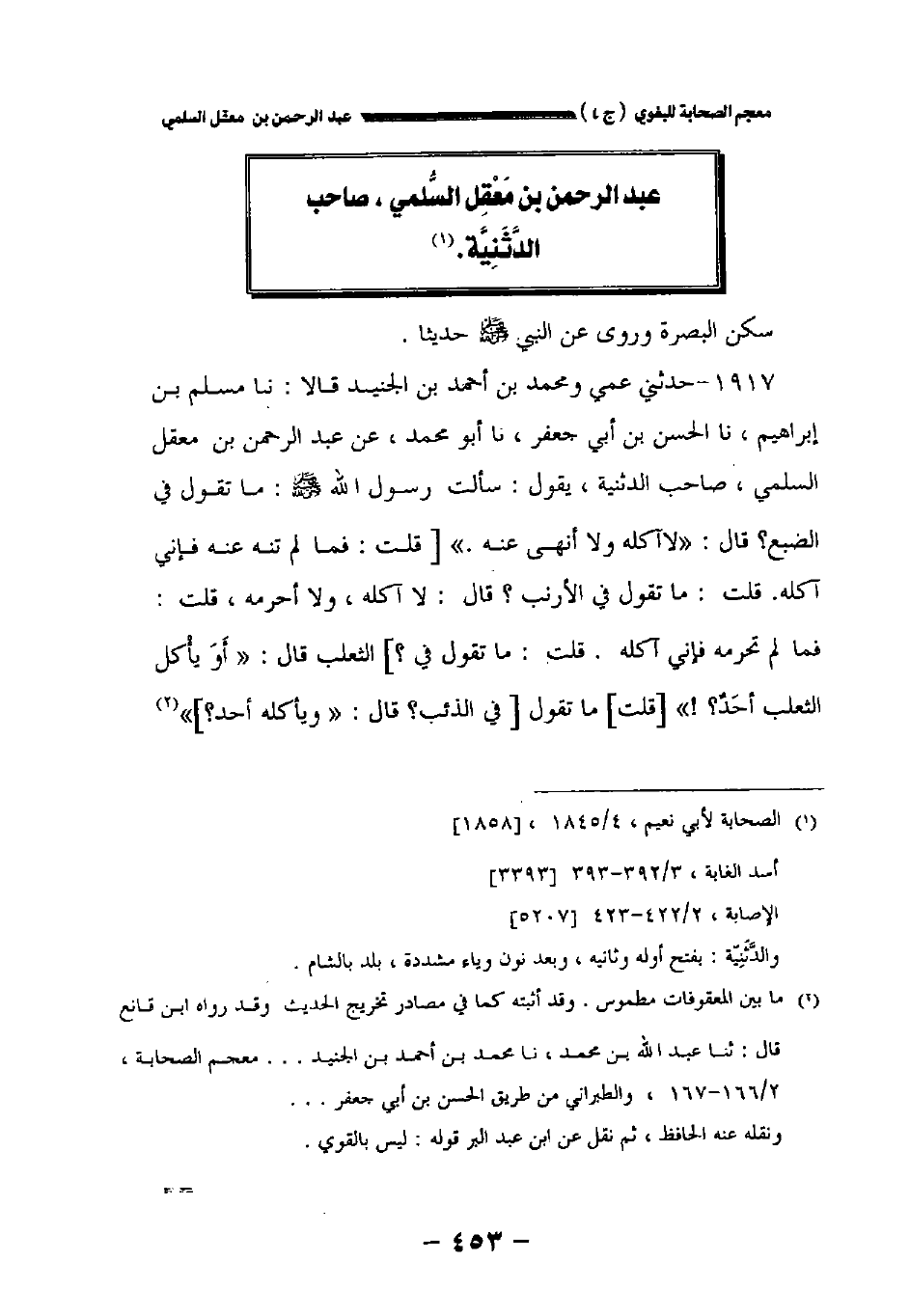 ١٩١٧ - حدثني عمي، ومحمد بن أحمد بن الجنيد، قالا: حدثنا مسلم بن إبراهيم نا الحسن بن أبي جعفر نا أبو محمد عن عبد الرحمن بن معقل السلمي صاحب الدثنية يقول: سألت رسول الله صلى الله عليه وسلم: ما تقول في الضبع؟ قال: " لا آكله ولا أنهى عنه " [قلت: فما لم تنه عنه فإني آكله. قلت: ما تقول في الأرنب؟ قال: لا آكله ولا أحرمه قلت: فما لم تحرمه فإني آكله. قلت: ما تقول في؟] الثعلب قال: " أو يأكل الثعلب أحد؟ " [قلت] ما تقول [في الذئب] قال: " ويأكله أحد؟ "