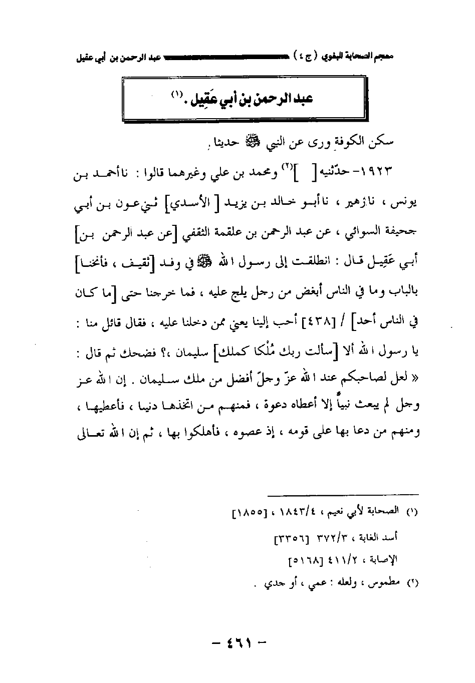 ١٩٢٣ - حدثنيه [] ومحمد بن علي وغيرهما قالوا: نا أحمد بن يونس نا زهير نا أبو خالد بن يزيد [الأسدي] حدثني عون بن أبي جحيفة السوائي عن عبد الرحمن بن علقمة الثقفي [عن عبد الرحمن بن] أبي عقيل قال: انطلقت إلى رسول الله صلى الله عليه وسلم في وفد [ثقيف فأنخنا] بالباب وما في الناس أبغض من رجل يلج عليه فما خرجنا حتى [ما كان في الناس أحد] //٤٣٨// أحب إلينا يعني ممن دخلنا عليه فقال قائل منا: يا رسول الله ألا [سألت ربك ملكا كملك] سليمان؟ فضحك ثم قال: " لعل لصاحبكم عند الله عز وجل أفضل من ملك سليمان إن الله عز وجل لم يبعث نبيا إلا أعطاه دعوة فمنهم من اتخذها دنيا فأعطيها ومنهم من دعا بها على قومه إذ عصوه فأهلكوا بها ثم إن الله تعالى