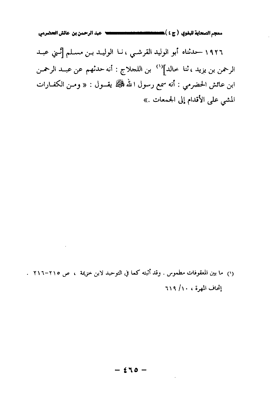١٩٢٦ - حدثناه أبو الوليد القرشي نا الوليد بن مسلم [حدثني عبد الرحمن بن يزيد حدثنا خالد] بن اللجلاج: أنه حدثهم عن عبد الرحمن بن عائش الحضرمي: أنه سمع رسول الله صلى الله عليه وسلم يقول: " ومن الكفارات المشي على الأقدام إلى الجمعات.