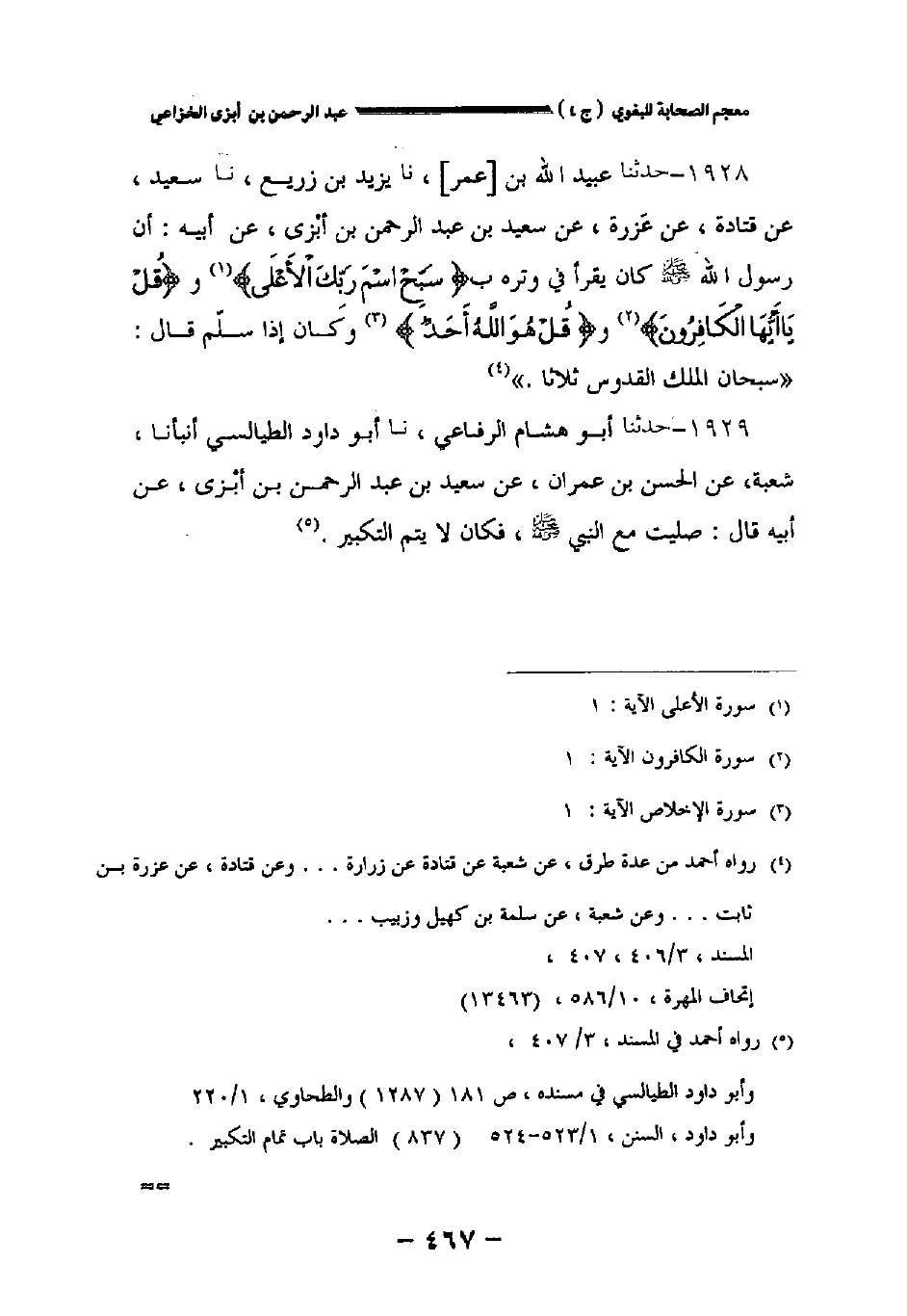 ١٩٢٨ - حدثنا عبيد الله بن [عمر] نا يزيد بن زريع نا سعيد عن قتادة عن عزرة عن سعيد بن عبد الرحمن بن أبزى عن أبيه أن رسول الله صلى الله عليه وسلم كان يقرأ في وتره بـ {سبح اسم ربك الأعلى} و {قل يا أيها الكافرون} و {قل هو الله أحد} وكان إذا سلم قال: " سبحان الملك القدوس ثلاثا.
