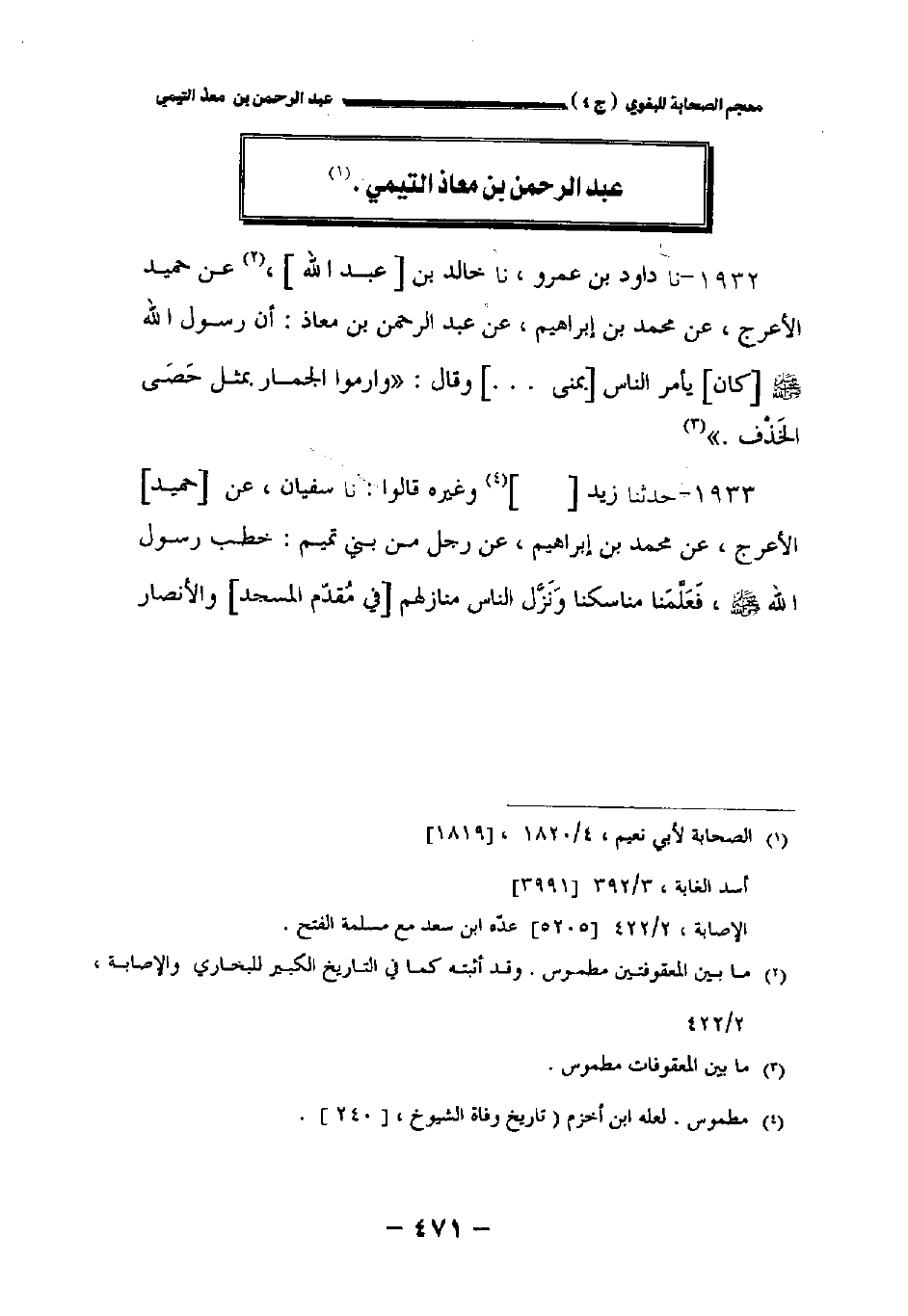 ١٩٣٢ - نا داود بن عمرو نا خالد بن [عبد الله] عن حميد الأعرج عن محمد بن إبراهيم عن عبد الرحمن بن معاذ: أن رسول الله صلى الله عليه وسلم [كان] يأمر الناس [بمنى ... ] وقال: " وارموا الجمار بمثل حصى الخذف.