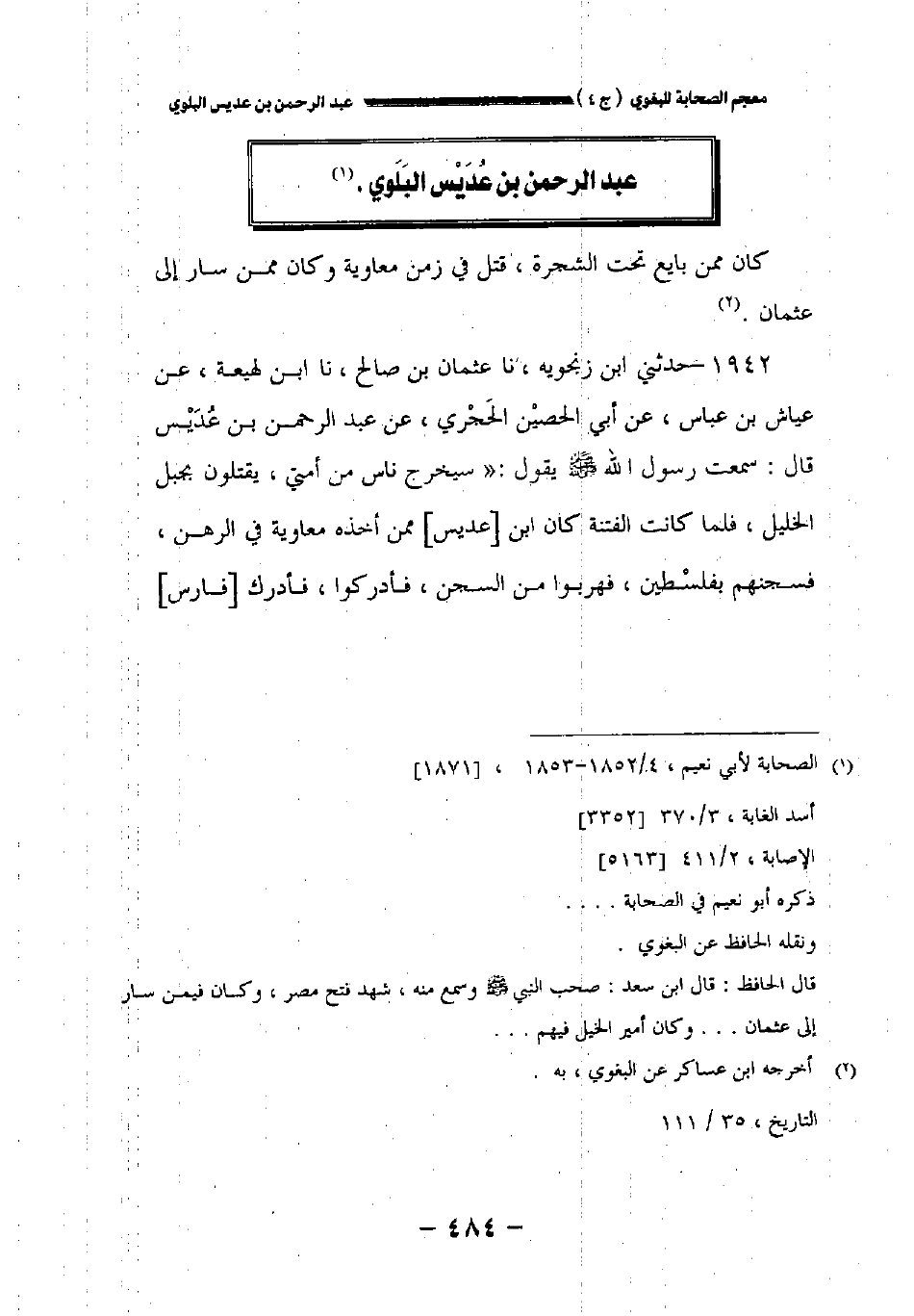 ١٩٤٢ - حدثني ابن زنجويه نا عثمان بن صالح نا ابن لهيعة عن عياش بن عباس عن أبي الحصين الحجري عن عبد الرحمن بن عديس قال: سمعت رسول الله صلى الله عليه وسلم يقول: " سيخرج ناس من أمتي يقتلون بجبل الخليل فلما كانت الفتنة كان ابن [عديس] ممن أخذه معاوية في الرهن فسجنهم بفلسطين فهربوا من السجن فأدركوا فأدرك [فارس]