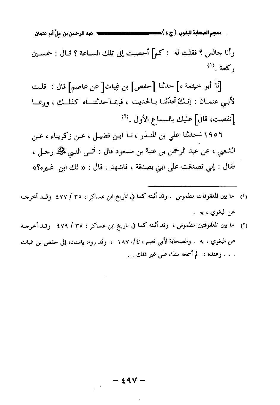 [نا أبو خيثمة] حدثنا [حفص] بن غياث [عن عاصم] قال: قلت لأبي عثمان: إنك تحدثنا بالحديث فربما حدثتناه كذلك وربما [نقصت قال] عليك بالسماع الأول.
