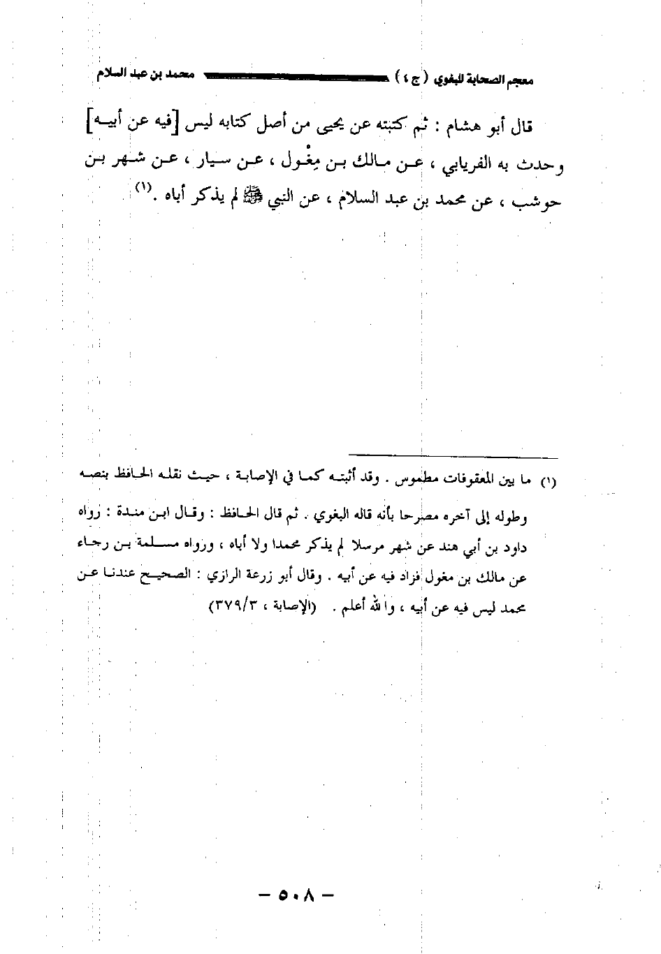 قال أبو هشام: ثم كتبته عن يحيى من أصل كتابه ليس [فيه عن أبيه] وحدث به الفريابي عن مالك بن مغول عن سيار عن شهر بن حوشب عن محمد بن عبد السلام عن النبي صلى الله عليه وسلم لم يذكر أباه.