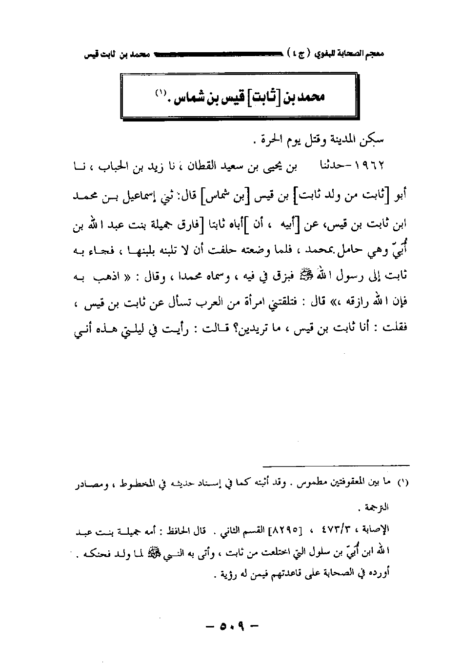 ١٩٦٢ - حدثنا بن يحيى بن سعيد القطان نا زيد بن الحباب نا أبو [ثابت من ولد ثابت] بن قيس [بن شماس] قال: حدثني إسماعيل بن محمد بن ثابت بن قيس عن [أبيه أن] أباه ثابتا [فارق جميلة بنت عبد الله بن أبي وهي حامل بمحمد فلما وضعته حلفت أن لا تلبنه بلبنها فجاء به ثابت على رسول الله صلى الله عليه وسلم فبزق في فيه وسماه محمدا وقال: " اذهب به فإن الله رازقه " قال: فتلقتني امرأة من العرب تسأل عن ثابت بن قيس فقلت: أنا ثابت بن قيس ما تريدين؟ قالت: رأيت في ليلتي هذه أني