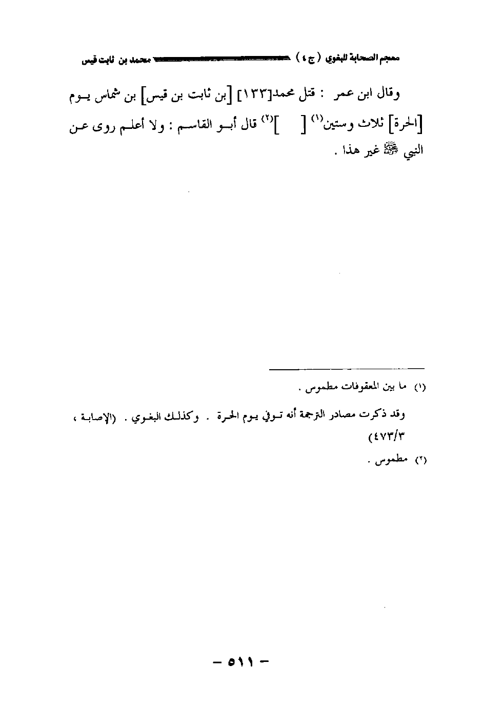 وقال ابن عمر: قتل محمد //١٤٥// [بن ثابت بن قيس] بن شماس يوم [الحرة] ثلاث وستين [] قال أبو القاسم: ولا أعلم روى عن النبي صلى الله عليه وسلم غير هذا.