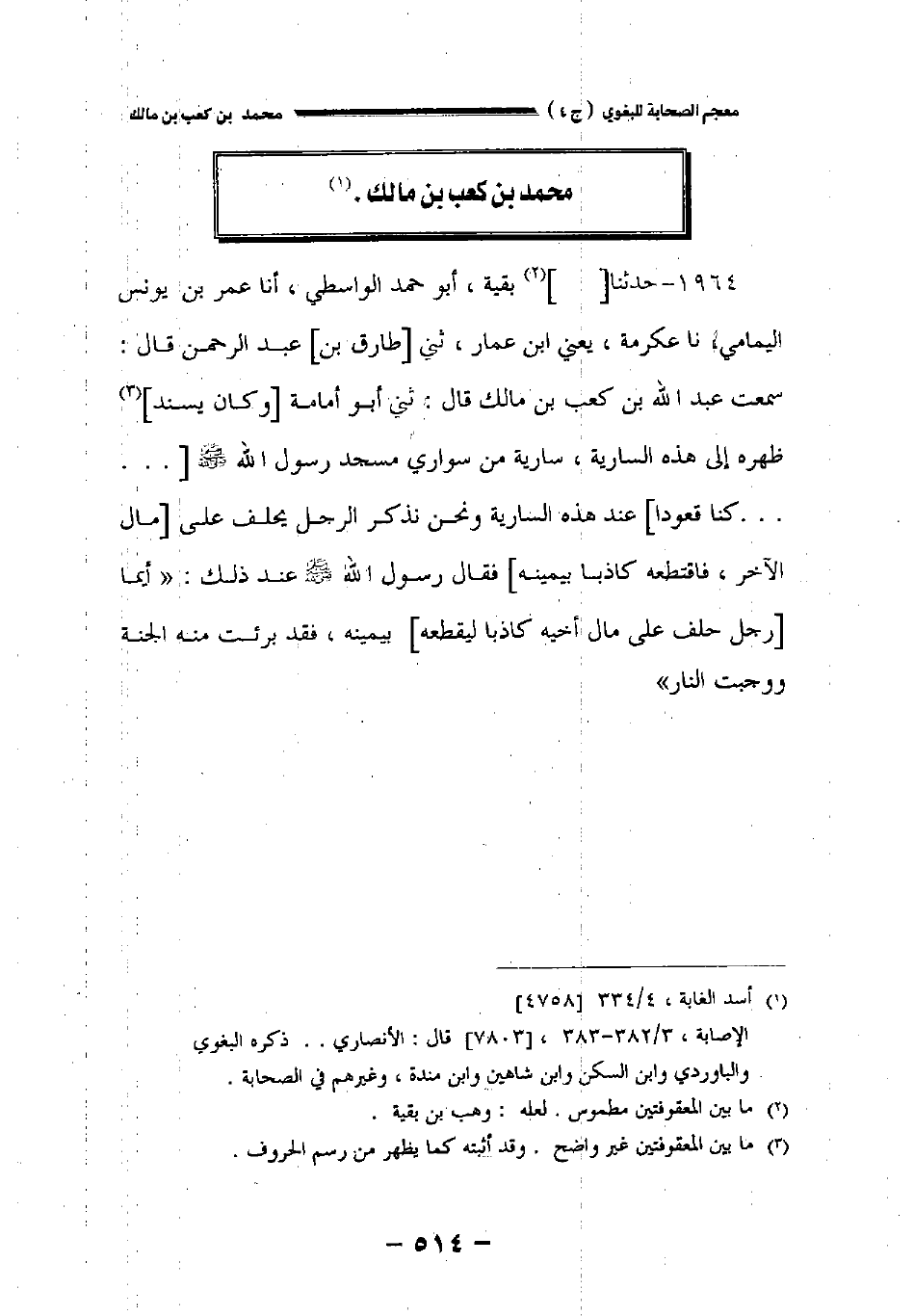 ١٩٦٤ - حدثنا [] بقية أبو حمد الواسطي أخبرنا عمر بن يونس اليمامي نا عكرمة يعني ابن عمار حدثني [طارق بن] عبد الرحمن قال: سمعت عبد الله بن كعب بن مالك قال: حدثني أبو أمامة [وكان يسند] ظهره إلى هذه السارية سارية من سواري مسجد رسول الله صلى الله عليه وسلم [. . . . . كنا قعودا] عند هذه السارية ونحن نذكر الرجل يحلف على [مال الآخر فاقتطعه كاذبا بيمينه] فقال رسولا لله صلى الله عليه وسلم عند ذلك: " أيما [رجل حلف على مال أخيه كاذبا ليقطعه] بيمينه فقد برئت منه الجنة ووجبت النار "