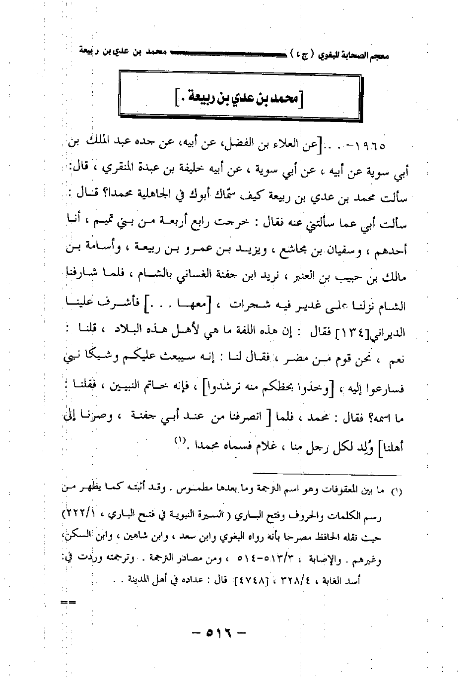 ١٩٦٥ - [عن العلاء بن الفضل عن أبيه عن جده عبد الملك بن أبي سوية عن أبيه عن أبي سوية عن أبيه خليفة بن عبدة المنقري قال: سألت محمد بن عدي بن ربيعة كيف سماك أبوك في الجاهلية محمدا؟ قال: سألت أبي عما سألتني عنه فقال: خرجت رابع أربعة من بني تميم أنا أحدهم وسفيان بن مجاشع ويزيد بن عمرو بن ربيعة وأسامة بن مالك بن حبيب بن العنبر نريد ابن جفنة الغساني بالشام فلما شارفنا الشام نزلنا على غدير فيه شجرات [معها. . . . .] فأشرف علينا الديراني // ١٤٦// فقال: إن هذه اللفة ما هي لأهل هذه البلاد قلنا: نعم نحن قوم من مضر فقال لنا: إنه سيبعث عليكم وشيكا نبي فسارعوا إليه [وخذوا بحظكم منه ترشدوا] فإنه خاتم النبيين فقلنا: ما اسمه؟ فقال: محمد فلما [انصرفنا من عند أبي حفنة وصرنا إلى أهلنا] ولد لكل رجل منا غلام فسماه محمدا.