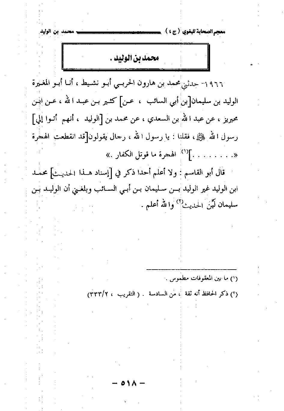 قال أبو القاسم: ولا أعلم أحدا ذكر في [إسناد هذا الحديث] محمد بن الوليد غير الوليد بن سليمان بن أبي السائب وبلغني أن الوليد بن سليمان لين الحديث والله أعلم.