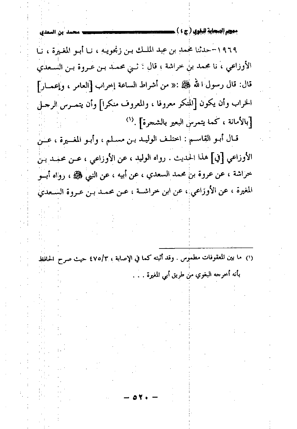 ١٩٦٩ - حدثنا محمد بن عبد الملك بن زنجويه نا أبو المغيرة نا الأوزاعي نا محمد بن خراشة قال: حدثني محمد بن عروة بن السعدي قال: قال رسول الله صلى الله عليه وسلم: " من أشراط الساعة إخراب [العامر وإعمار] الخراب وأن يكون [المنكر معروفا والمعروف منكرا] وأن يتمرس الرجل [بالأمانة كما يتمرس البعير بالشجرة].