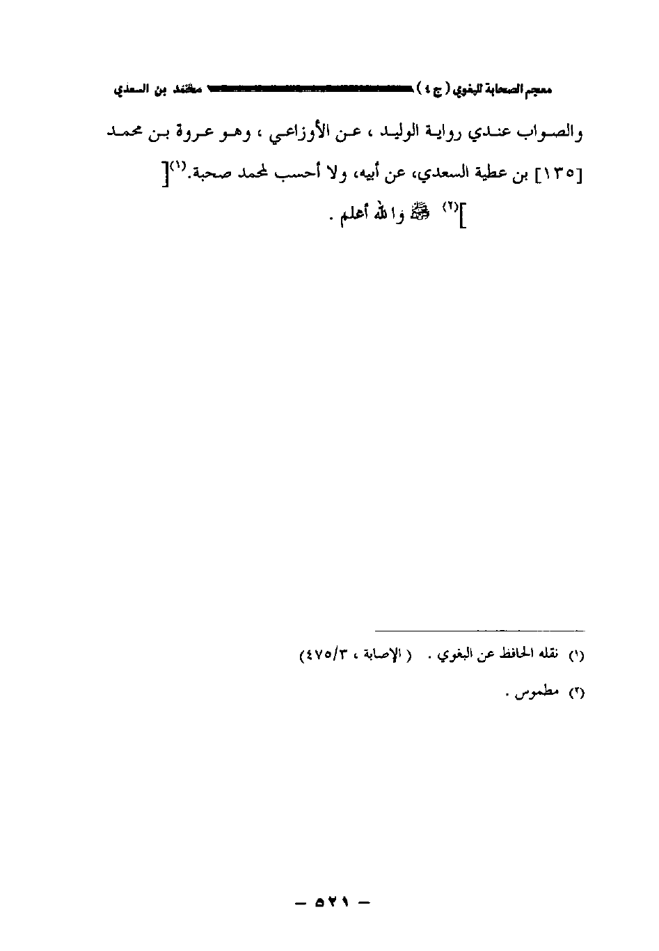 والصواب عندي رواية عن الأوزاعي وهو عروة بن محمد // // بن عطية السعدي عن أبيه ولا أحسب لمحمد صحبة. [