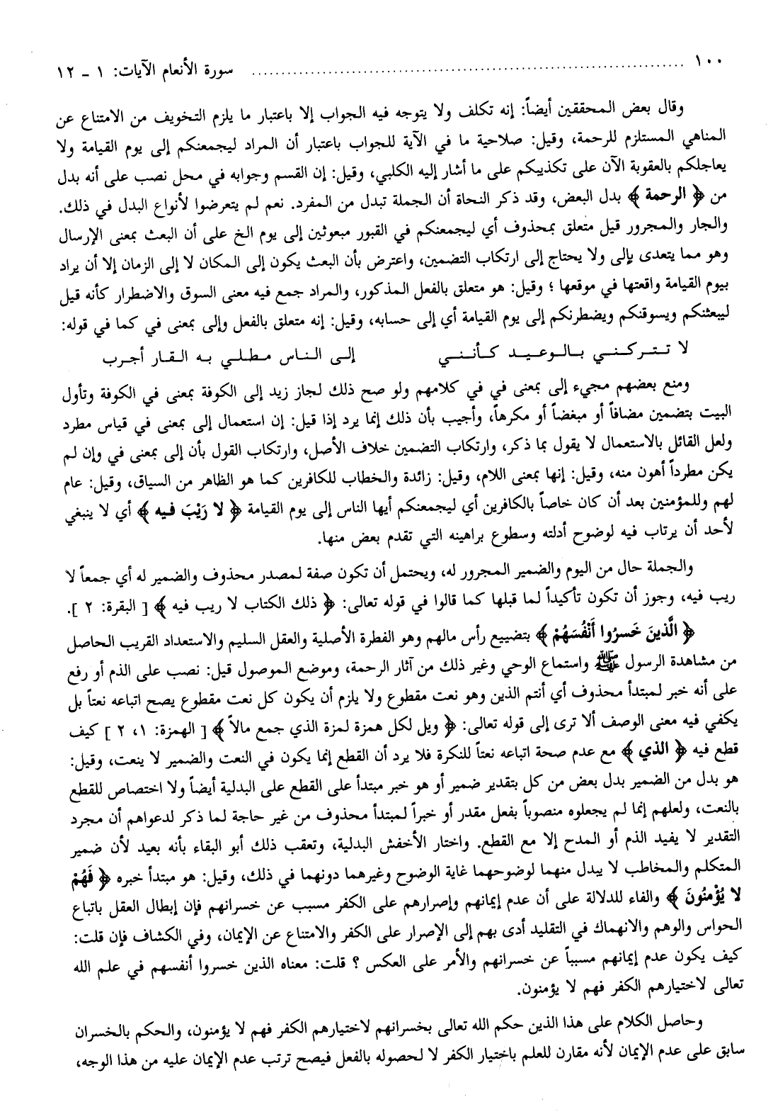 وحاصل الكلام على هذا الذين حكم الله تعالى بخسرانهم لاختيارهم الكفر فهم لا يؤمنون، والحكم بالخسران سابق على عدم الإيمان لأنه مقارن للعلم باختيار الكفر لا لحصوله بالفعل فيصح ترتب عدم الإيمان عليه من هذا الوجه،